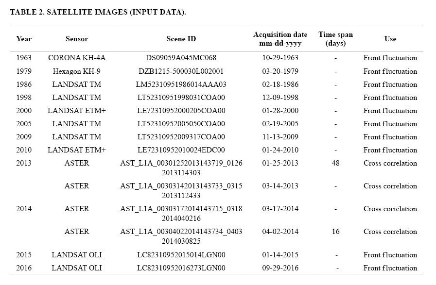 The present study is based on four 15 m spatial resolution ASTER images (3N band) (Table 2). The ASTER images were obtained from the United States Geological Survey (USGS) Earth Explorer portal, and there were acquired during the ablation period years 2013 and 2014 (January-April), contain no significant seasonal snow, and are devoid of clouds.Note that time separation between processed scenes is crucial for the calculation of surface velocities and their uncertainties (Berthier et al., 2005), i.e., separation in days must be long enough to show the velocity signal in the slower sectors of the glacier, but short enough to preserve the morphological features that are tracked down in the correlation process.