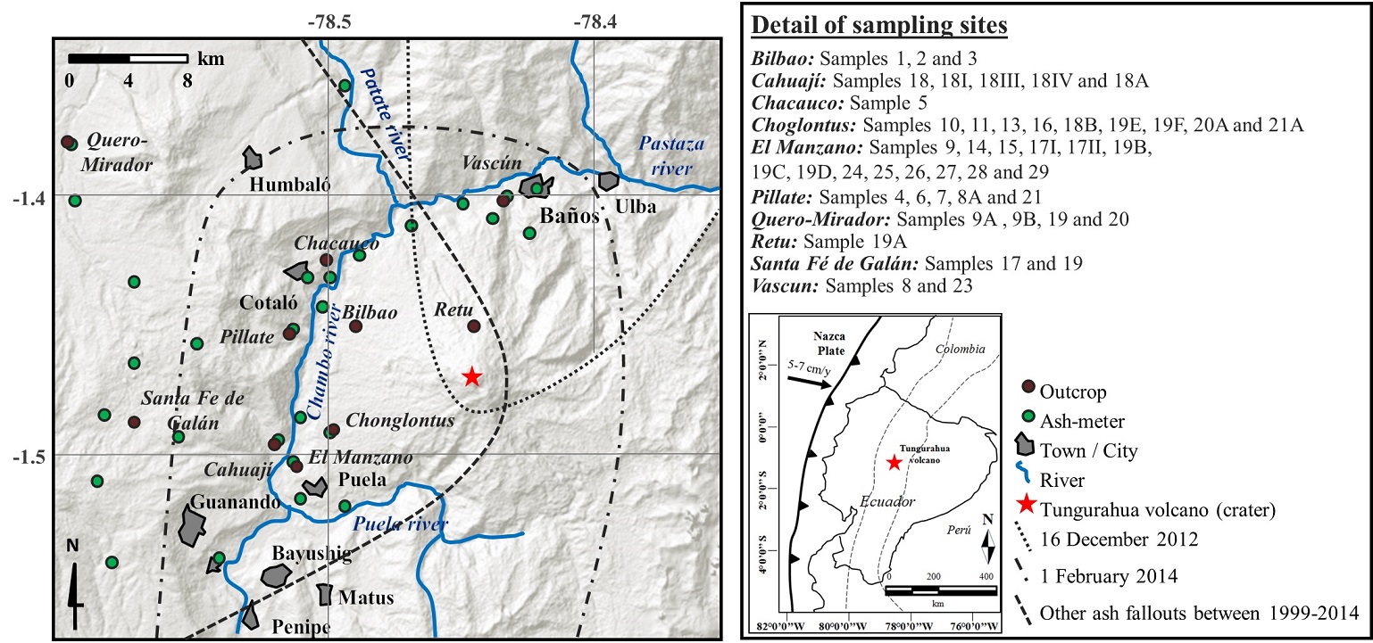 Tungurahua volcano (01º28’ S; 78º27’ W, 5,019 m a.s.l., Fig. 1) is an active andesitic strato-volcano at the Northern Andean Volcanic Zone (NAVZ; Kley et al., 1999), distant 120 km south of Quito (Ecuador), with a record of five post-Columbian eruptive cycles (1641, 1773, 1886, 1916-18 and 1999 to the time of writing). Since 1999 and up to 2014, Tungurahua volcano has erupted ca. 0.13 km3 of bulk tephra, frequently dispersed towards its west flank, through various types of volcanic activity in four major eruptive phases (Bustillos et al., 2016). Several studies with different techniques have included the analysis of these tephras in very specific time periods such as those of 1999-2001, 2006, 2010, 2012, 2013, and 2014 (e.g., Le Pennec et al., 2004; Ruiz et al., 2004; Troncoso et al., 2006; Bustillos, 2010; Bustillos et al., 2011; Le Pennec et al., 2012; Eychenne et al., 2012; Bustillos et al., 2013; Bernard et al., 2013; Eychenne et al., 2013; Parra et al., 2015; Romero et al., 2017). Currently, there is not a continuous database of tephras between 1999 and 2013 in Tungurahua, doing harder to establish their variations through eruptive-style transitions and their related feeding mechanisms. In the current contribution, we study the temporal variations of tephra fallouts as consequence of changing eruption mechanisms between 1999-2014 at Tungurahua volcano. We also look at the amount of fine ash ejected by the volcano for health hazard considerations. Overall, our work provides a comprehensive dataset on the characteristics of ash erupted by Tungurahua during fifteen years of eruptive activity.