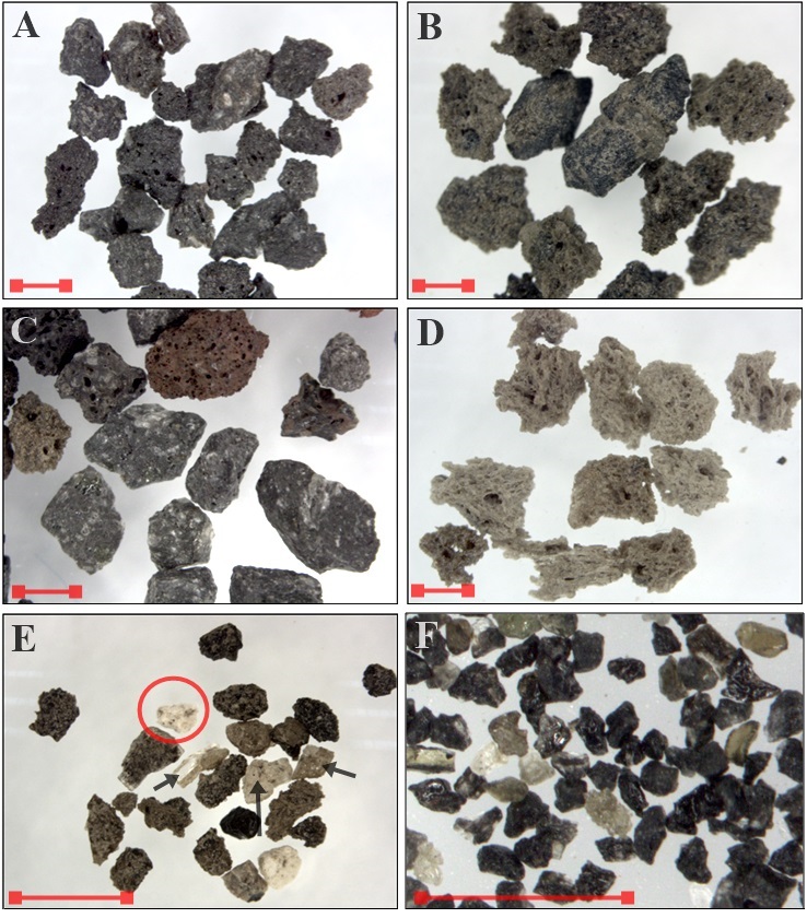 It can be dark (black), brown or reddish. Black scoria (Fig. 3A) correspond to dark, sometimes glassy particles, generally with vesicles. Brown scoria is a transparent or semi-transparent (glassy) brown material with vesicles (Fig. 3A). Reddish scorias are subrounded to sub-angular vesiculated particles altered by hidrothermal processes (Fig. 3B).