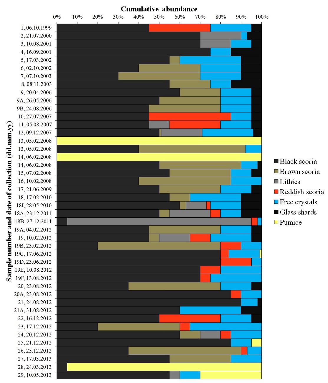 The components of the ashes since 2010 up to 2013 show chaotic patterns in time if compared to the pre-2010 eruptions. In fact, glass shards (<5 to 10%), altered scoria (<5 to 30%), brown scoria (10-45%) and lithics (10-90%) are sporadically present (Fig. 4). Black scoria remains always present but in varying proportion (50-90%), similarly to free crystals (<10 to 30%) (Fig. 4). The glassy particles were not vesicular or exhibited moderate-to-high vesicularity, a widespread variety of shapes (fluid, filamentous and blocky) with smoothed and broken perimeters (Table 2). A noticeable change occurs since December 2012 when glass shards are not longer observed (Fig. 4). However, the morphology of glassy particles (scoria and pumice) revealed to be low-to-moderate in vesicularity with molten and broken perimeters (Table 2). Also, relevant amounts (25-95%) of pumice are observed within the samples collected in March and May 2013 (Fig. 4).