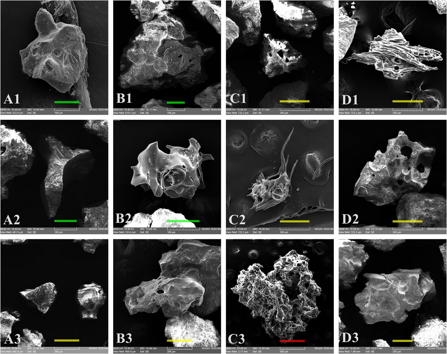 FIG. 5. Qualitative characterization of juvenile ash particles using SEM-EDS in function of their vesicularity (from A1 to D1), shape (from A2 to D2) and surface/perimeter (from A3 to D3). A1: Sample 19; B1: Sample 6; C1: Sample 1; D1: Sample 13; A2: Sample 5; B2: Sample 19A; C2: Sample 13; D2: Sample 4; A3: Sample 5; B3: Sample 9; C3: Sample 13; D3: Sample 20. For sample details please refer to table 1 and figure 1. Scale bars correspond to 100 µm (green), 200 µm (yellow) and 500 µm (red).