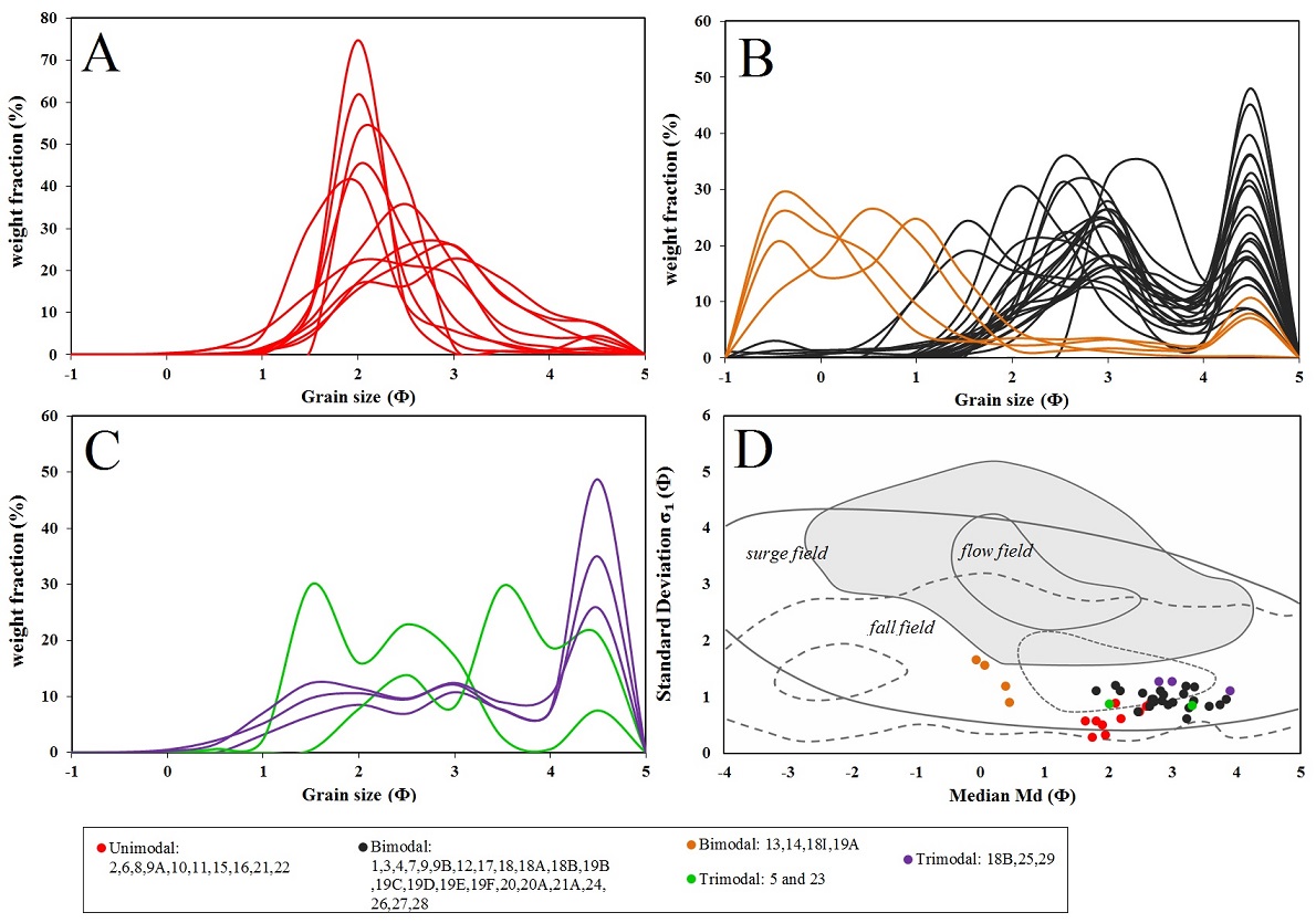 FIG. 6. Grain size distribution (GSD) of tephra fall samples. A. Unimodal GSD (red); B. Bimodal GSDs, where two main bimodal populations are recognized (orange and dark grey); C. Trimodal GSD with also two main populations (green and violet); D. Walker (1971) classification for GSD of pyroclastic deposits. The samples here studied plot in the field of fall deposits. Colours from lines and circles correspond to each cluster of unimodal or polymodal samples.