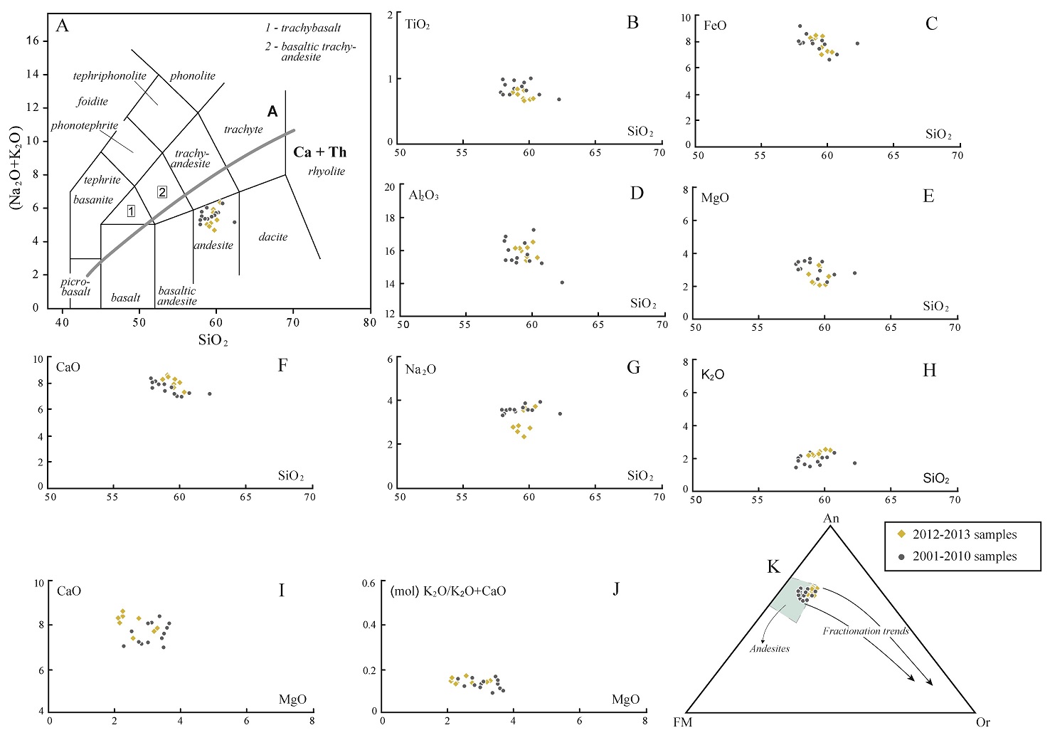 Harker diagrams are shown in figure 7B-H. Linear trends are only identified in FeO, CaO, and K2O versus SiO2 variation diagrams, while a major scattering is observed in TiO2, Al2O3 and MgO contents. In general, samples collected in 2012-2013 are slighly enriched in CaO and K2O (Fig. 7F and 7H), but depleted in MgO and Na2O (Fig. 7E and 7G) if they are compared with the samples that represent the 2001-2010 eruptions. CaO versus MgO (Fig. 7I), molar K2O/K2O+CaO versus MgO (Fig. 7J) and the pseudoternary system defined by Opx-An-Or (Fig. 7K) (Díaz-Alvarado et al., 2011; Castro, 2013) are particularly significant for visualizing linear trends in co-genetic igneous rocks. However, Tungurahua samples display a significant scattering for a scarce SiO2 variation. The higher CaO and K2O and lower MgO contents observed in the 2012-2013 samples regarding to the rest of the studied ash deposits separate two groups of samples in these diagrams.