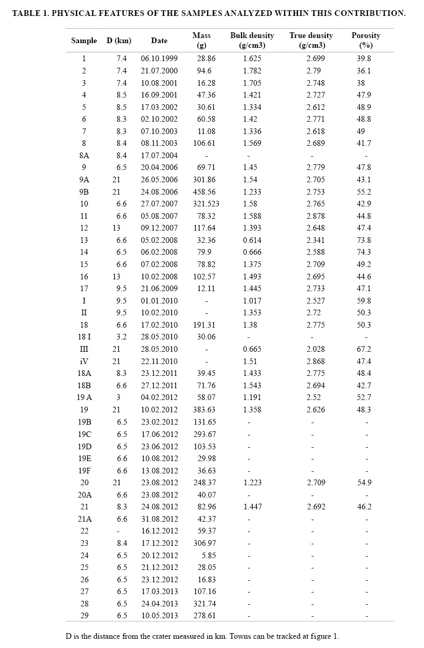 The first tephra sample collected in October 1999 was dominantly compound of black scoria (45%), with a large proportion of altered reddish scoria (30%), free crystals (20%) and scarce glass shards (5%) (Fig. 4). Glassy particles were moderately vesicular, with jagged perimeter. Subsequent ash emissions up to 2001 ejected increasing black scoria (70-75%), lithics (0-20%), free crystals (5-10%) and increasing glass shards (5-15%) (Fig.4) suggesting more participation of juvenile magma. These glassy particles had low vesicularity and blocky shapes (Table 2). Between 2002 and 2003 the ash was compound of dominant black scoria (30-55%), brown scoria (5-40%), decreasing amounts of free crystals (10-30%) and relative stable amounts of glass shards (10-15%) (Fig. 4). These glassy particles had none-to-low in vesicularity, shaped as inter-vesicular walls and their perimeter was smoothed or molten (Table 2).