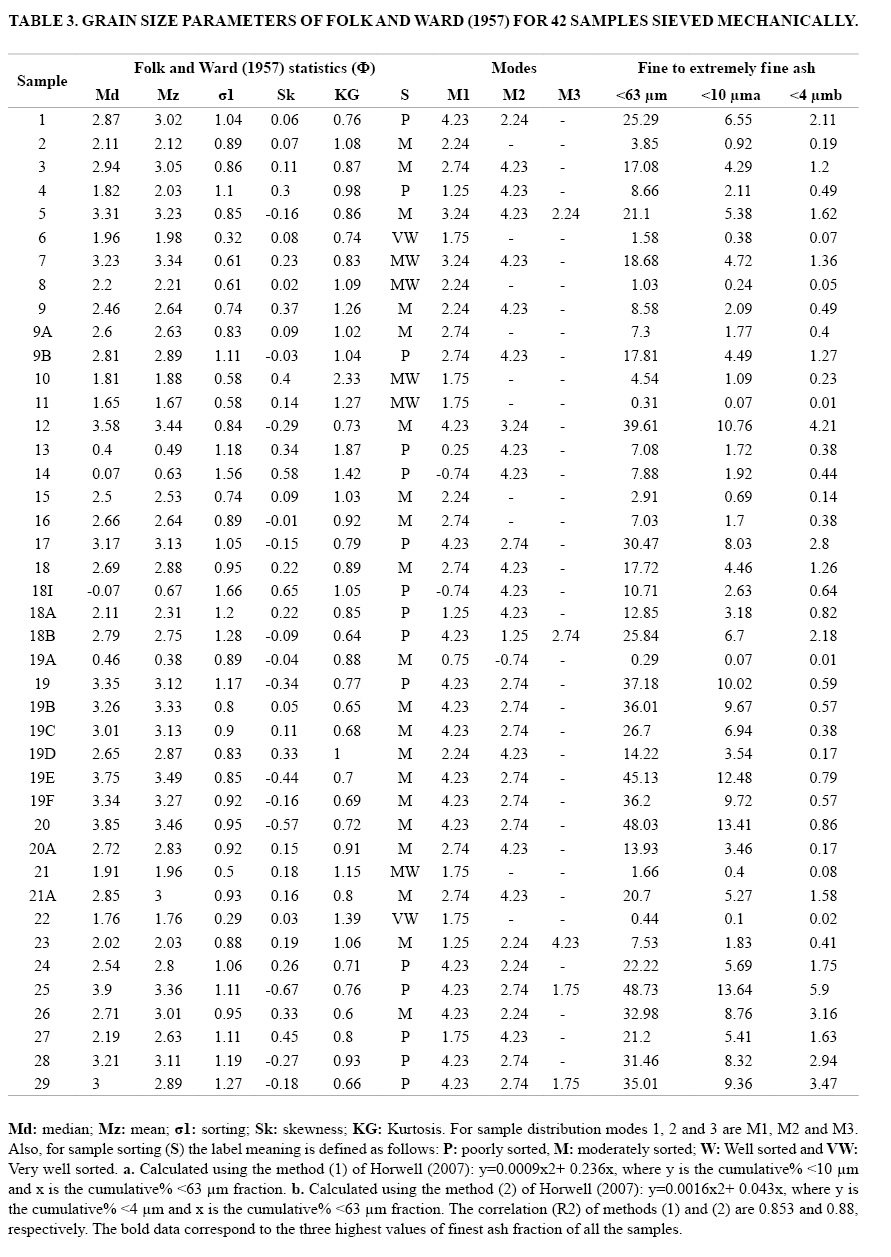 Tephra was mechanically sieved from 63 to 2,000 µm (-1 to 4Ф) at regular steps of 0.5Ф (Ф=-log2D/D0, with D being the particle diameter and D0 a reference diameter as 1 mm), using a Fritsch analysette instrument, during a period of 3-5 minutes in order to avoid the over-fracturing of tephra. Respective grain size fractions were weighted and their mass fraction (wt%) was determined using the total mass of each sample. The sample statistics (Md=median; Mz=mean; σ1=sorting or standard deviation; Sk=skewness; KG=kurtosis) were then calculated using the Gradisat package (Blott and Pye, 2001) which uses the Method of Moments in Microsoft Visual Basic programming language. Linear interpolation is used to calculate statistical parameters by the Folk and Ward (1957) graphical method, and to derive physical descriptions (such as “very coarse sand” and “moderately sorted”) (Blott and Pye, 2001). We also compared these descriptions with the classification of Cas and Wright (1987) which is commonly used for the study of volcanic deposits. After measuring the <63 µm (4Ф) ash fraction, we used the method of Horwell (2007) to estimate both “thoracic” (<10 µm; 6.7Ф) and “respirable” (<4 µm; 8Ф) ash amounts particles.