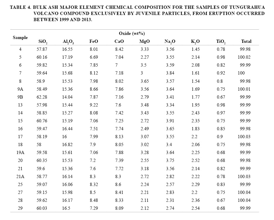 The major element chemical characterization of bulk ash (particles finer than 4Ф) samples was analyzed by Energy Dispersion Spectrometer (EDS) for SEM with a Qantax EDS (Bruker instrument). The procedure consisted in the mapping and averaging of 100 points in order to avoid heterogeneity effects from individual particles. These particles were not separated prior geochemical analyses, thus the results from samples exclusively compound by fresh juvenile particles are discussed. Work distance was 26 mm, with Secondary Electron Detector (SE) and the software Spirit 1.8 with a detection limit of 1% for the recognized elements.