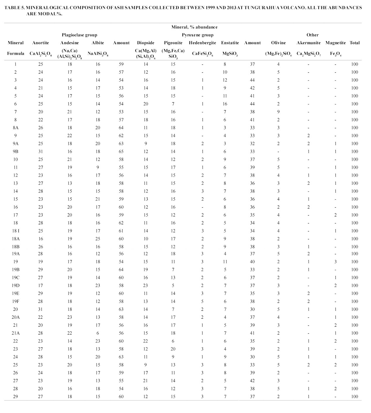 The recognized plagioclases corresponded to anorthite (16-31%), andesine (13-22%) and albite (9-21%). The plg was generally observed in the ash samples (53-65%), and its maximum relative proportion is found in the 2006 samples (62-65%). Pyroxenes consist of both cpx and opx. The cpx was identified as diopside (9-20%), pigeonite (7-18%) and, in a few cases, of hedenbergite (1-3%). On other hand, the only estantite was recognized for opx (3-12%). In general, the highest proportions of px were found in ash samples from 2001 and 2002 eruptions (Table 5; 41-44%). Olivine was forsteritic, varying from 2 to 9% and with its highest relative proportion in the samples of year 2003 (sample 7). As accessory minerals, akermanite and magnetite were found (Table 5). Akermanite varied from 1-2%, and its highest relative proportion occurs in 2006 ash samples, though it was also found in 2008, 2010, 2011, and 2012 samples. The magnetite is in the range from 1 to 3% (3% in the 2012 ash).