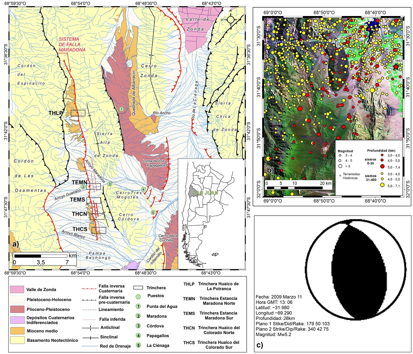 Fig. 1. a. Ubicación área de estudio y localización de las trincheras analizadas a lo largo del Sistema de Falla Maradona (SFM); Trinchera Huaico de la Potranca (THLP), Trinchera Estancia Maradona Norte (TEMN), Trinchera Estancia Maradona Sur (TEMS), Trinchera Huaico del Colorado Norte (THCN) y Trinchera Huaico del Colorado Sur (THCS); b. Sismicidad instrumental de la región. Con círculos rojos se indican los sismos superficiales y con amarillos, los intermedios a profundos; c. Mecanismo focal del sismo ocurrido el 11 de marzo de 2009, de Mw 5.2, a 28 km de profundidad (Ammirati et al. 2015). Se puede apreciar la consistencia del plano nodal obtenido con la estructura del SFM.