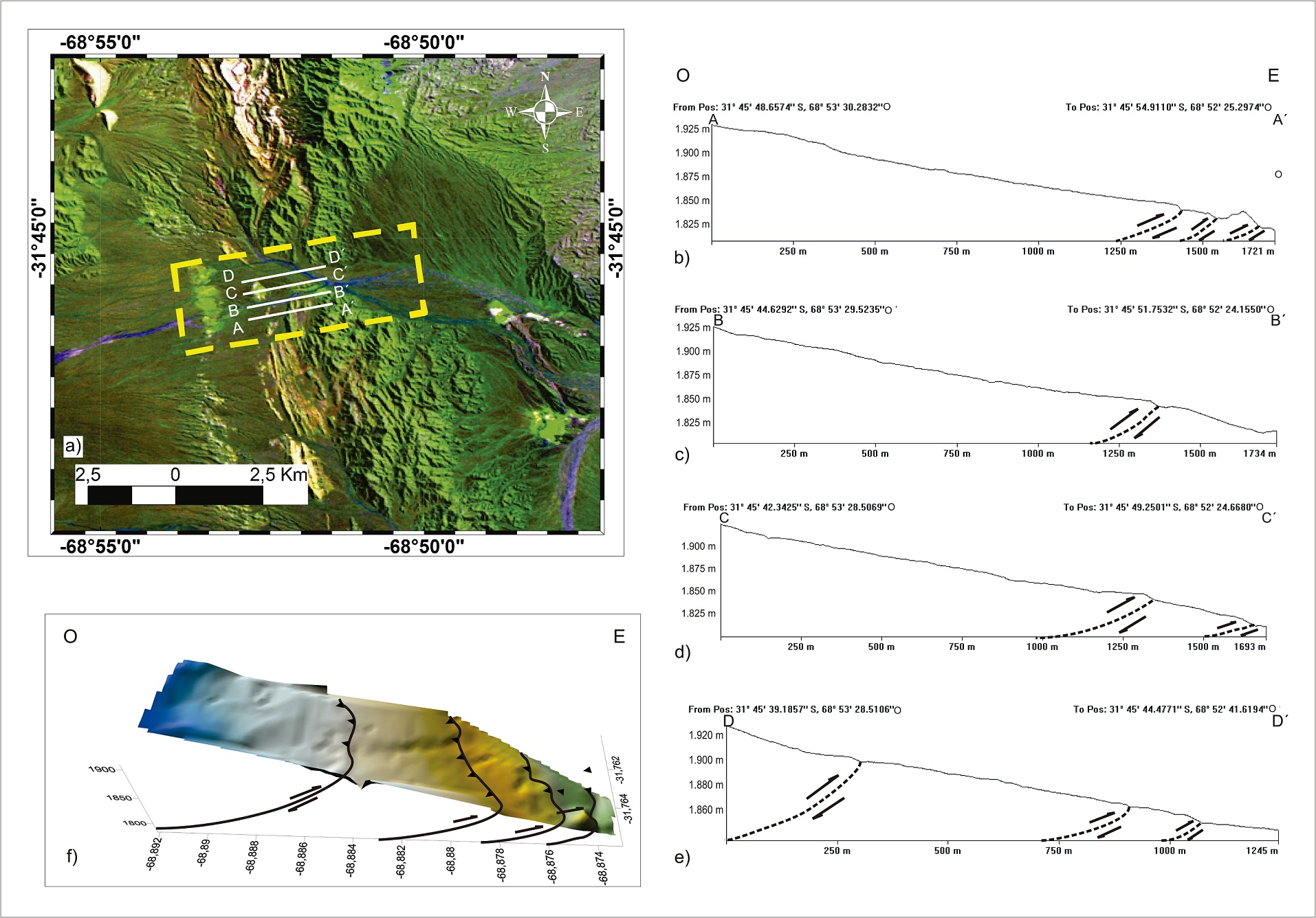 Mediante el GPS diferencial se caracterizaron los rasgos topográficos de las principales escarpas de falla identificadas en la sección donde se ubica la TEMN (31°46’ S) (Fig. 1a y 6a). Se obtuvieron cuatro perfiles de elevación, que permitieron visualizar los cambios de pendiente en cada transecta. Se descartó un control litológico para estos cambios, ya que todos los perfiles fueron efectuados en depósitos aluviales que no presentaban variaciones en su composición litológica que hiciera presumir una erosión diferencial. La medición de los perfiles topográficos de alta resolución (O-E) en todos los casos fue perpendicular a la escarpa, donde las fallas no se encuentran expuestas (Fig. 6a). De sur a norte se definieron los perfiles A-A’, B-B’, C-C’ y D-D’. En el perfil A-A’ (Fig. 6b) se identificaron tres escarpas ubicadas al este de la falla principal, en un recorrido de 1,72 km con una diferencia de cota de 100 m entre los puntos de mayor y menor altura. El perfil B-B’ (Fig. 6c) posee solo un cambio topográfico, interpretado como una escarpa de falla, en un recorrido de 1,73 km con una diferencia de cota de 100 m entre los puntos extremos del perfil. El perfil C-C’ (Fig. 6d) presenta dos escarpas en un tramo de 1,69 km y un desnivel de 75 m entre ambos extremos. Finalmente, en el perfil D-D’ (Fig. 6e) ubicado más al norte, se identificaron dos escarpas de falla en el sector este del perfil y una escarpa en el sector oeste, en un tramo de 1,24 km y con un desnivel de 60 m entre D y D’. Con la generación del DEM se logró identificar, además, al menos cuatro quiebres de pendientes y/o contrastes de rugosidad, considerados en este estudio escarpas de falla que no cortarían la superficie (Fig. 6f).