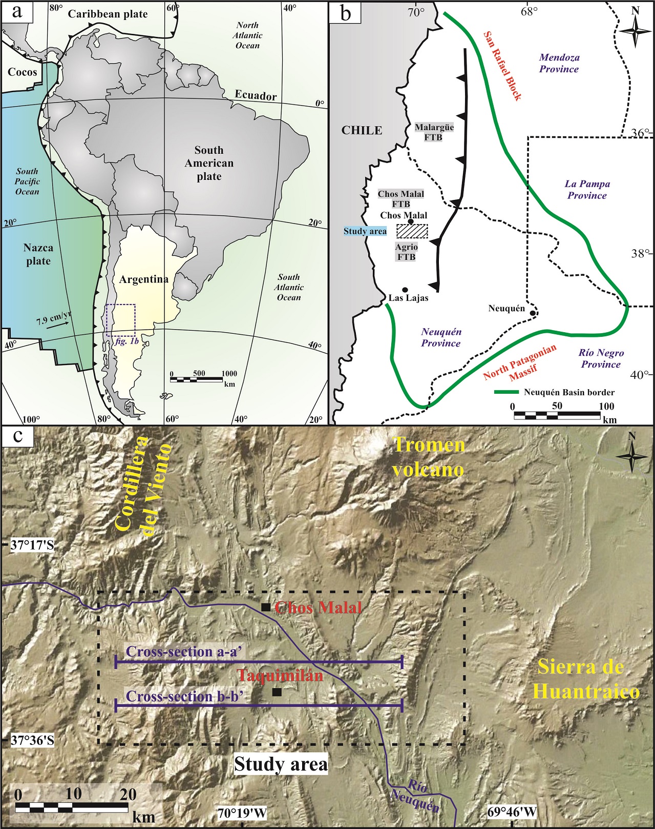 The Agrio fold and thrust belt (Ramos, 1978) is part of the Southern Central Andes and it is located at the Central-Western region of Argentina (Fig. 1a). The contractional deformation in this sector began in the Late Cretaceous related to the convergence between the Nazca plate and the South American plate. The region of study is located in the Neuquén Basin, which is one of the most important oil producing sedimentary basins of Argentina. In this zone, several works on the stratigraphy and the structure have been conducted because of the scientific and economic interest due to the presence of hydrocarbon deposits (Groeber, 1929, 1946; Zöllner and Amos, 1973; Minniti et al., 19861; Gulisano and Gutiérrez Pleimling, 1995; Vergani et al., 1995; Kozlowski et al., 1998; Zapata et al., 1999; Zapata and Folguera, 2005; Leanza et al., 2006; Zamora Valcarce et al., 2009; Rojas Vera et al., 2015; Turienzo et al., 2014, 2018; Sánchez et al., 2014, 2015).
