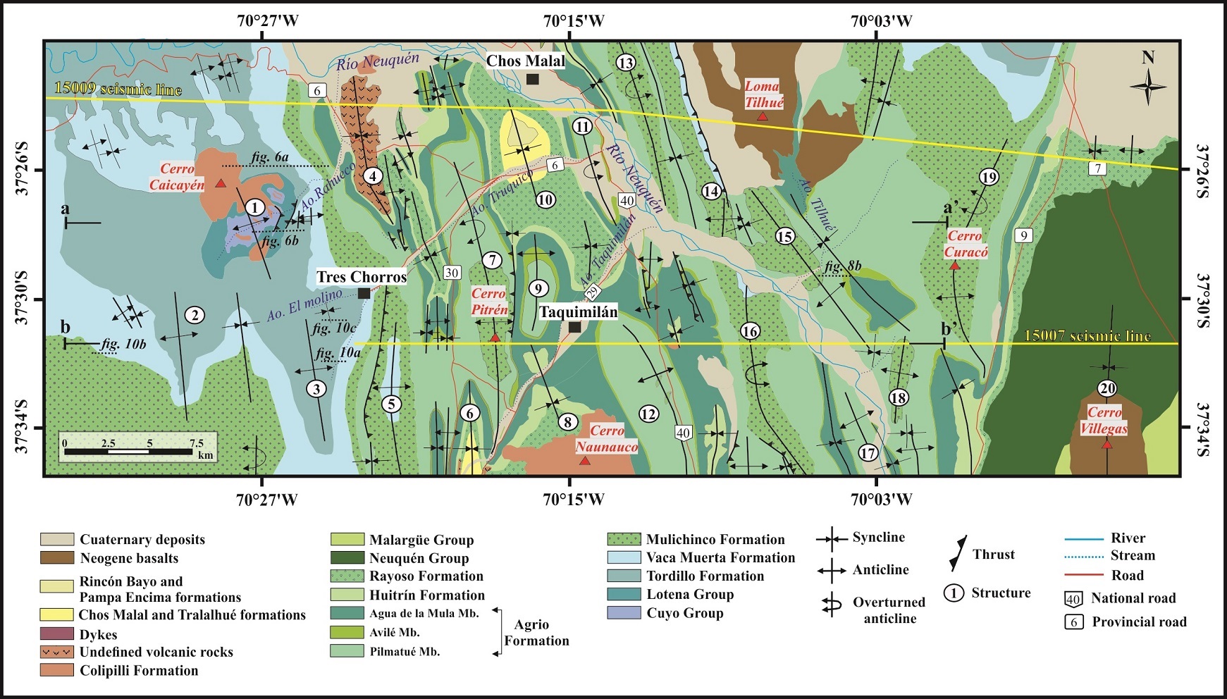 This work was financed by CONICET PIP 0583, CONICET P-UE47CO, FONCYT PICT 2015-0419 y SECYTUNS PGI 24/h136. We are grateful to the Departmento de Geología of the Universidad Nacional del Sur and INGEOSUR-CONICET for logistical and financial support. We also acknowledge the Subsecretaría de Energía, Minería e Hidrocarburos of the Neuquén Province for providing the seismic lines and well information, and the Municipalidad of Chos Malal for supporting the field work. We greatly appreciate the comments and suggestions by reviewer J. Skármeta and Editor W. Vivallo, which considerably improved this paper.