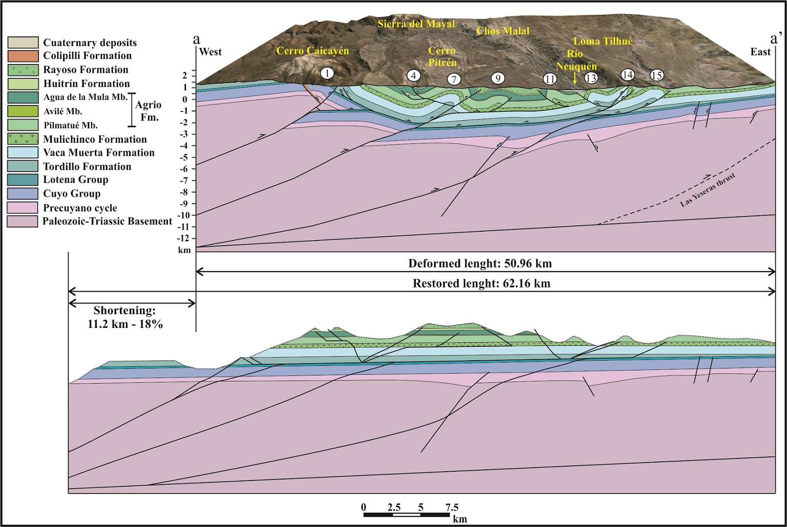 The reconstruction of the tectonic structures in depth along the north cross-section was analysed in conjunction with the information provided by seismic line 15009 (Fig. 4). Despite it ´s poor quality, this line shows west-dipping reflectors that allows the interpretation of the basement-cover contact geometry. The elevation of the basement-cover contact at the eastern sector of the seismic section is linked to the west-dipping Las Yeseras thrust (Fig. 4), responsible of a notable basement-cored anticline exposed outside the studied area. Although there are no exploration wells along this seismic line, these strong and continuous reflectors can be assigned to the Jurassic sedimentary sequences. Below them, diffuse reflectors with varying thicknesses suggest the occurrence of synrift deposits of the Precuyano Cycle (Fig. 4). These synrift sequences have been related with high angle normal faults, which have been slightly inverted during the subsequent compressive deformation in the Andes. Bed-length restoration of cross-section a-a’ (Fig. 5) allows to establish 11.2 km (18%) of shortening.