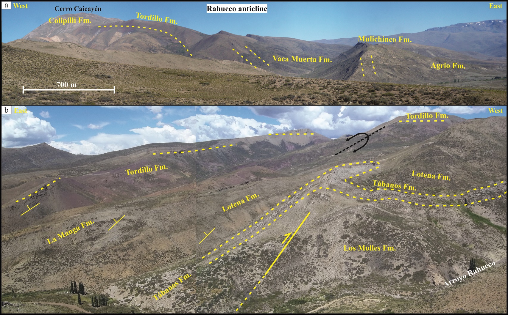 The oldest rocks exposed in this region correspond to the Late Jurassic Tordillo Formation, which are folded forming the El Cholar and Manzano anticlines (Fig. 3). These folds have wavelengths between 7 and 9 km and they locate south of the Rahueco anticline, thus basement rocks should be involved at depth. Both anticlines have east vergence, in which their eastern limbs dips 50°-60° E (Fig. 10a), and their western limbs dip of 15°-30° W (Fig. 10b). The El Cholar anticline is interpreted as a thick-skinned fault-propagation fold, with relatively minor displacement, and the Manzano anticline as a basement-involved fault-bend fold whose eastward movement produce thin-skinned deformation in the adjacent cover rocks (Fig. 9). Minor-scale folding affects the Tordillo Formation in the proximities of Tres Chorros (Figs. 3 and 10c), which can be considered thin-skinned structures probably detached from the underlying evaporites of the Auquilco Formation.