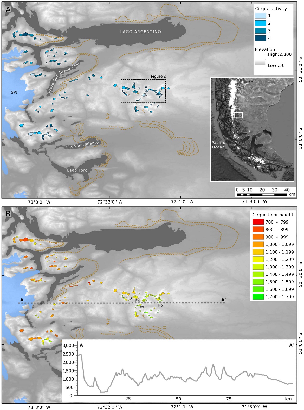 FIG. 1 A. Right box shows the location of the study area. Elevations were obtained from the SRTM model. The brown dotted line shows the major moraine systems east of Lago Argentino, Brazo Rico and Brazo Sur (Mercer, 1976; Strelin and Malagnino, 2000; and references therein), and south and east of Lago Toro and Lago Sarmiento respectively (Sagredo et al., 2011; García et al., 2012) these represent former outlet lobes during the LGM and prior glaciations. Cirque activity corresponds to 1. current glacier activity; 2. perennial snow activity; 3. no glacier or snow activity; 4. not categorized. Black dotted box shows SBMR area (Fig. 2). B. Mapped cirque floor elevations, which show the increase in elevation towards the east (from 700-799 m a.s.l. At east margin of SPIF, to 1,700-1,799 m a.s.l, on the eastern margin of SBMR). A-A’ shows a topographic profile from SPIF to easternmost SBMR. F3, F4, F6 and F7 refer to figures that contain photos that show the position of the SBMR glacial features pictures.
