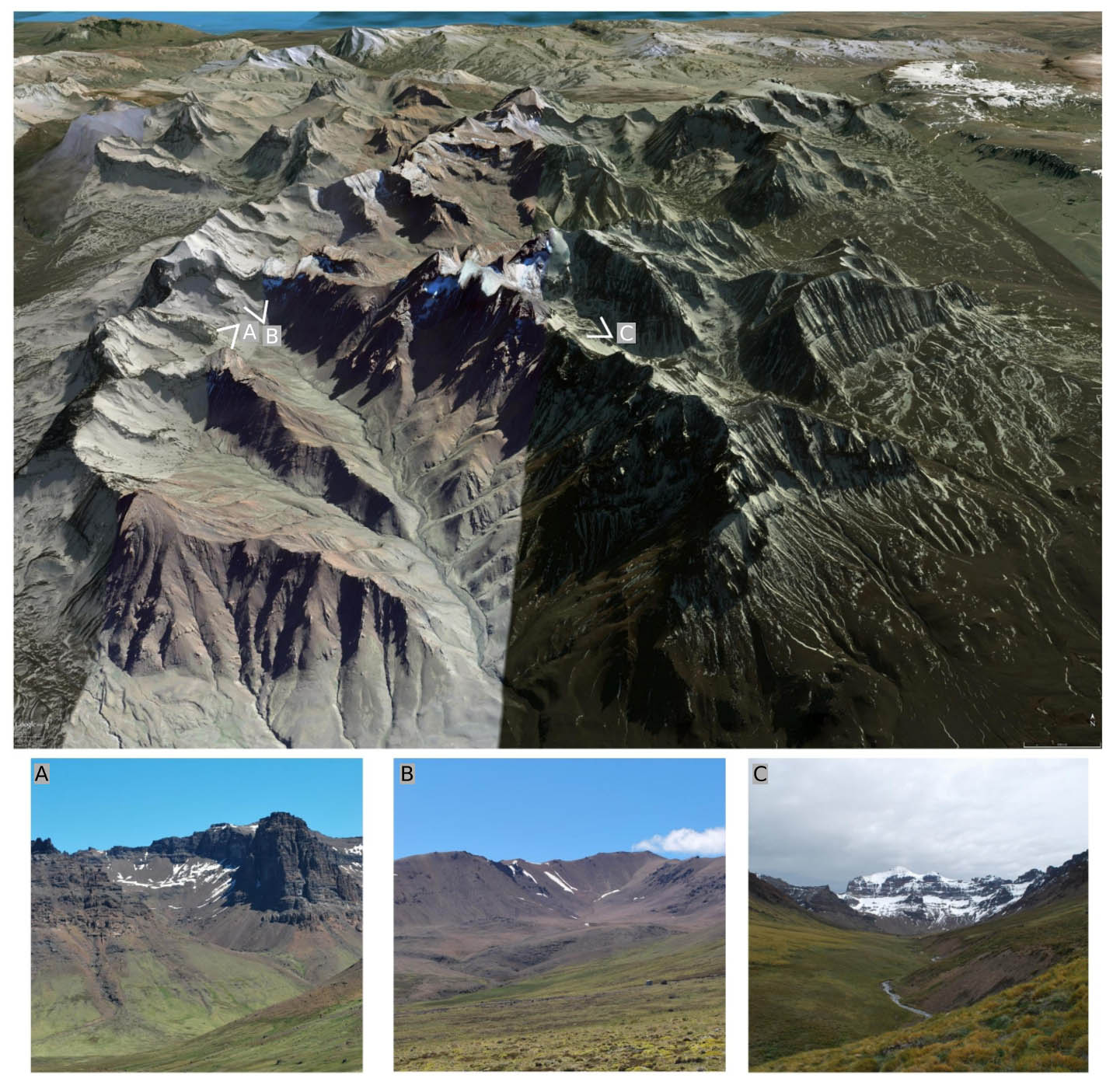 FIG. 2. Google Earth © image showing the study area from the SW. Photographs A and B (see location on Google image) show a hanging valley and glacial cirque, and photo C shows a glacial valley. Current snow and glacier processes are particularly active along the high elevations on the eastern side of the SBMR (i.e., see figure 1).