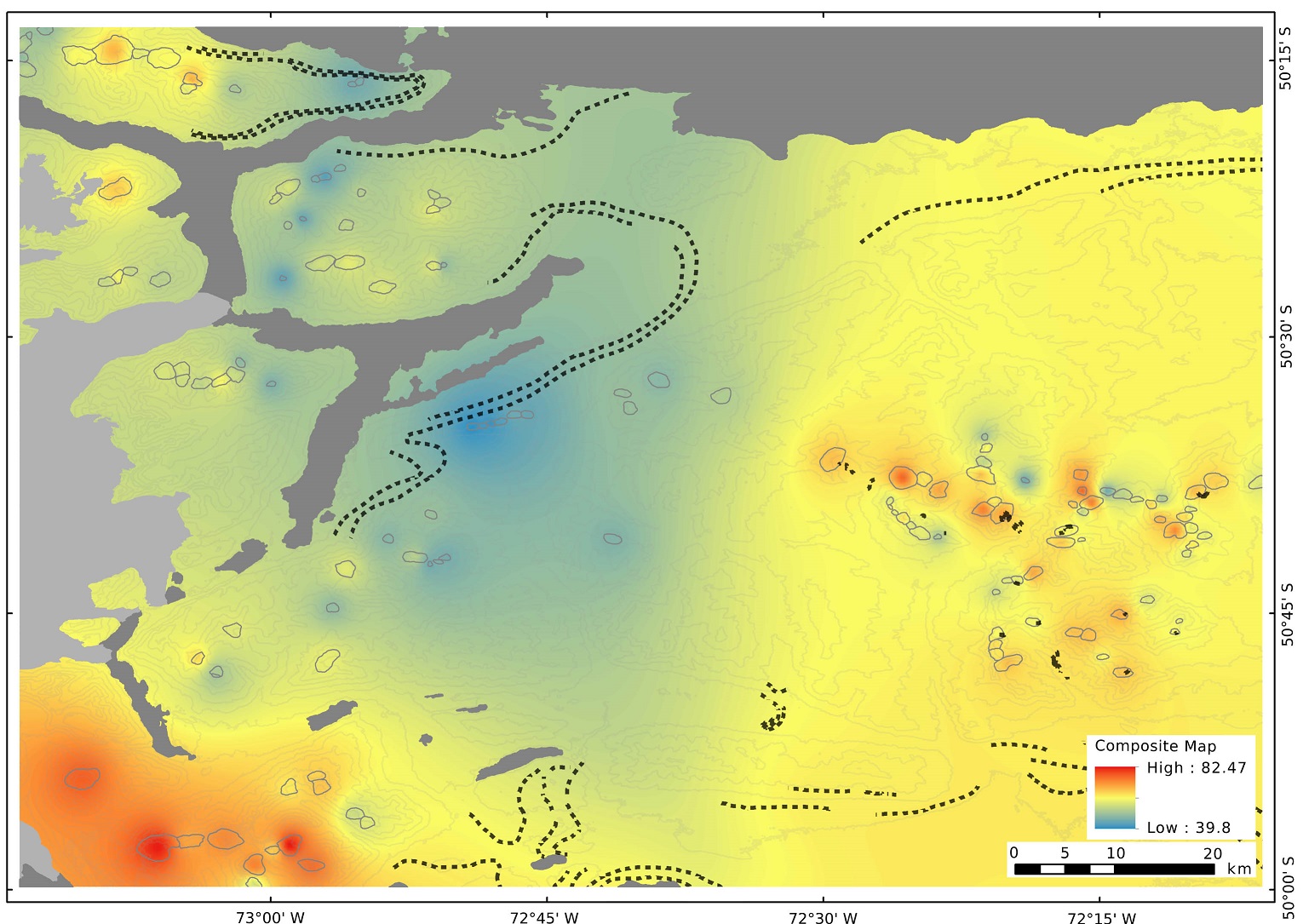 FIG. 11. Composite map of cirque attributes in the study area. Cirques were categorized using 10 parameters extracted from the morphometric analysis (Table 2). Black dotted lines show outlines of maximum extension glacier stages (see text). Areas with cirques closest to the SPIF, such as in the far SW, were partly covered or adjacent to the large ice sheet during the LGM (García et al., 2012; Strelin et al., 2011). This contributed to their higher areal development in relation to those located in the SBMR, which were isolated from the ice sheet outlet lobes. Note that high values (orange-red) show the spatial distribution of currently active snow/ice processes, which particularly for the Sierra Baguales, are conditioned by cirque floor elevations (Fig. 1) and the rainshadow effect. The lowest values (blue) spatially match with evidence of areas covered or adjacent to former outlet glaciers of the SPIF, and cirques with no evidence of current glacier or snow activity.