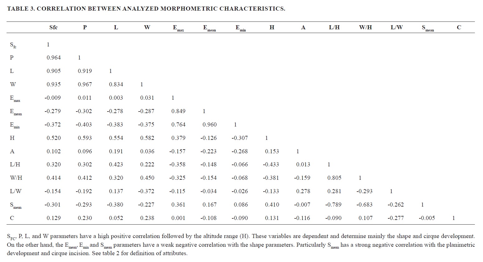 The positive and statistically significant correlations between the shape parameters L and Sfc (0.905), and W and Sfc (0.935), shown in table 3, allow us to infer that cirques tend to grow equally in both dimensions. This inference is further reflected by the average value of circularity (Table 2), 1.075, illustrating that those cirques tend to maintain a naturally circular shape (Aniya and Welch, 1981).