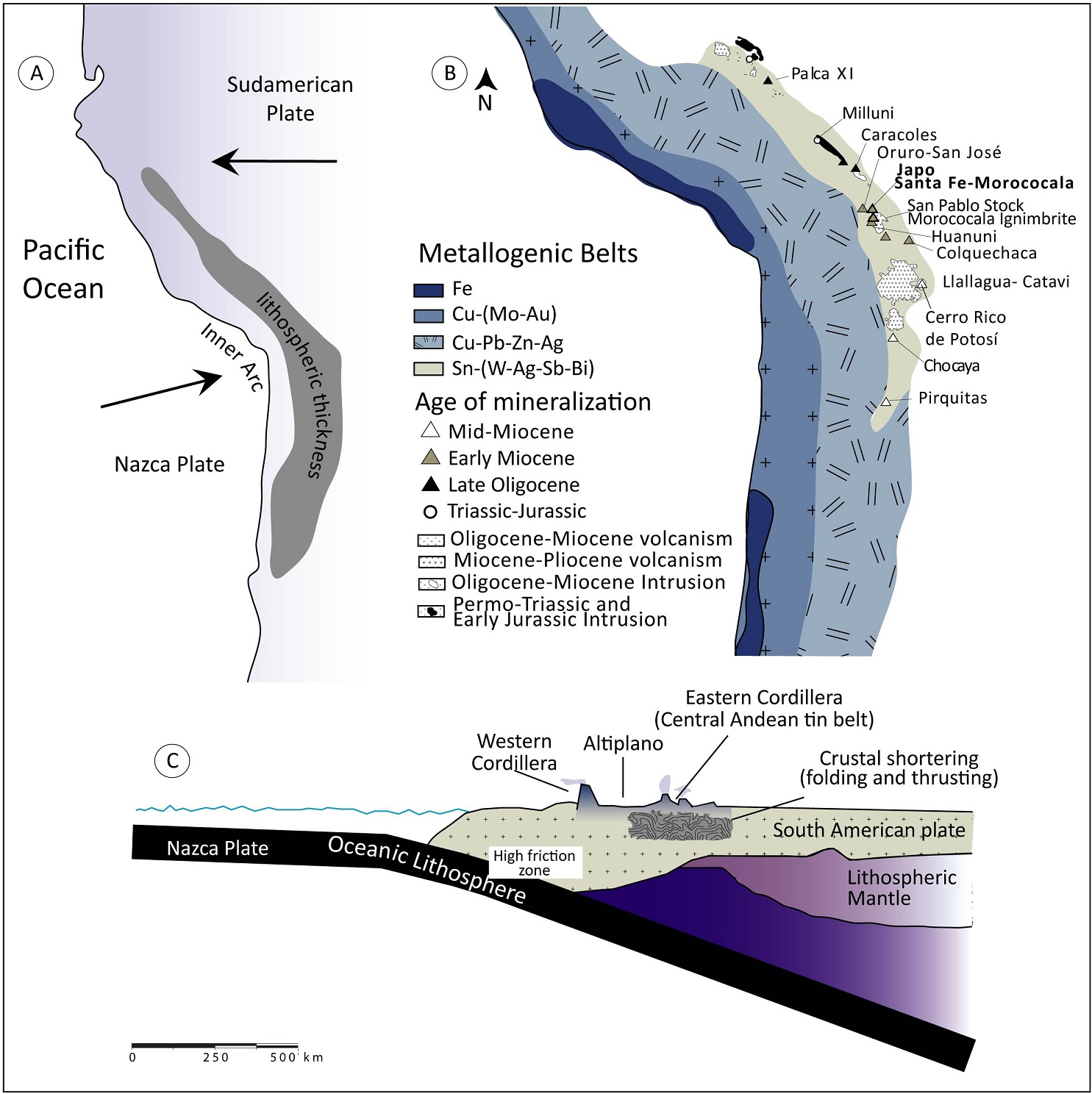 Fig. 1. Principal metallogenic belts and ore deposits of the Central Andean Tin belt (after Mlynarczyk and William-Jones, 2005). A. Plate tectonics, volcanism and lithospheric thickness; B. Relevant ore deposit with time in the Central Andean tin belt; C. Schematic cross-section of the Andean continental margin, showing the relationships.