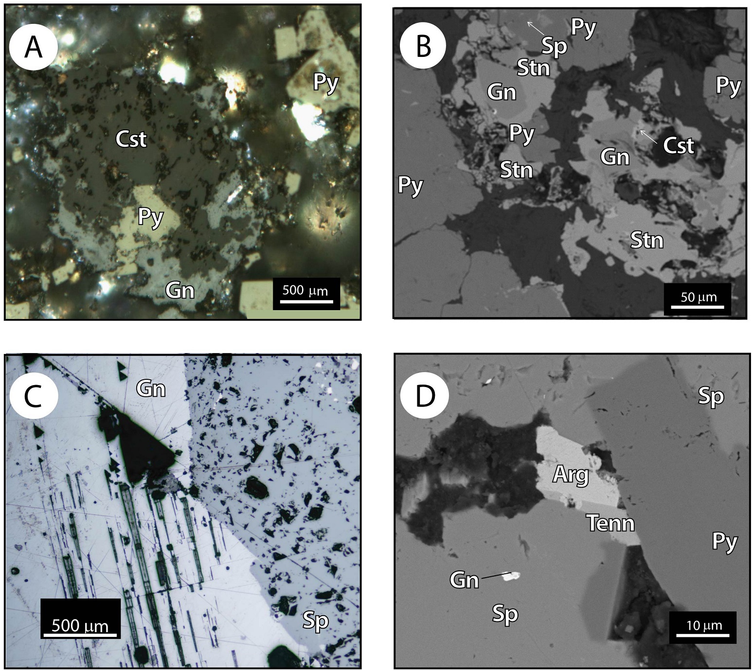 Other sulfides are pyrite, arsenopyrite, pyrrhotite, stibnite and marcasite. Pyrite occurs in all deposits as grains, up to 5 mm in size, associated with quartz and cassiterite and, occasionally, with galena, sphalerite, arsenopyrite, stannite and sulfosalts. Arsenopyrite crystals, up to a few millimeters in size, occur in association with pyrrhotite, covellite and marcasite. Some of them show anomalous anisotropy. Acicular stibnite and boulangerite crystals, up to several millimeters in size, are mostly filling cavities (Fig. 6D).