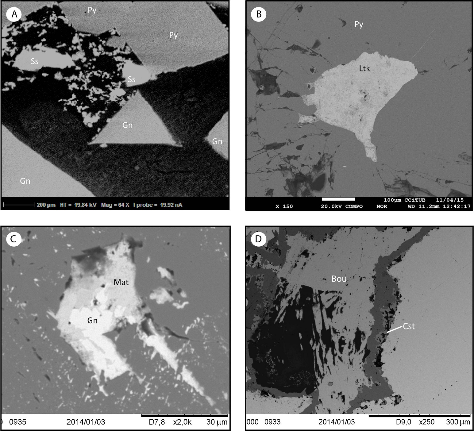 Pb-rich sulfosalts are very fine, with grain size under 30 µm. They include cylindrite (Pb3Sn4FeSb2S14) and phases of (SbS3) series as boulangerite (Pb5Sb4S11), jamesonite (Pb4FeSb6S14) and zinckenite (Pb9Sb22S42). Viaeneite [(Fe,Pb)4S8O] is an unusual oxysulfide that was also recognized in Santa Fe. Until now, it had only been reported by Kucha et al. (1996).