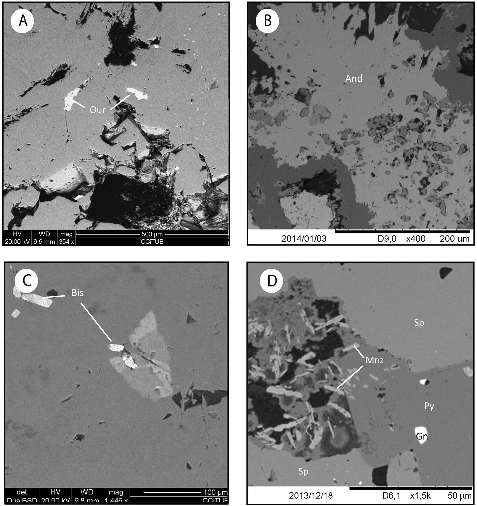 Both country rocks and ores were sampled in the Japo, Santa Fe and Morococala mines and outcrops. Additionally, 5,000 m of drill cores from the Japo mine were logged and sampled. For this study, 169 rock samples were collected in the SFD: 108 from drill cores, 38 in the mine and 23 in outcrops. Mineral assemblages were studied in 40 polished thin sections using standard petrographic microscopy. Additionally, 30 polished ore sections were analyzed with a Hitachi TM-1000 table-top scanning electron microscope (SEM), at the Departament d’Enginyeria Minera, Industrial i TIC of the Universitat Politècnica de Catalunya and also in a ESEM Quanta 200 FEI, XTE 325/D8395 at the Serveis Cientícs i Tecnològics de la Universitat de Barcelona(CCiT-UB). This equipment allowed us to obtain back-scattered electron (BSE) images and qualitative chemical analyses by energy dispersive X-ray spectrometry (EDS). Quantitative analyses were obtained with an electron probe microanalyzer (EPMA) JEOL JXA-8230, at the CCiT-UB. The analyses were carried out under the following conditions: 20 KeV, 20 nA, beam diameter of 1 μm, and a counting time of 30 s; the used standards were skutterudite (NiKα, AsKα, FeKα, CoKα), sphalerite (ZnKα, SnLα), cuprite (CuKα), marcasite (SKα), stibnite (SbLα), Ag (AgLα) and crocoite (PbMα) . The numbers of analyzed points were: cassiterite, 60; sphalerite, 70; stannite, 78; sakuraiite, 10; kërsterite, 4; and sulfosalts; 32.
