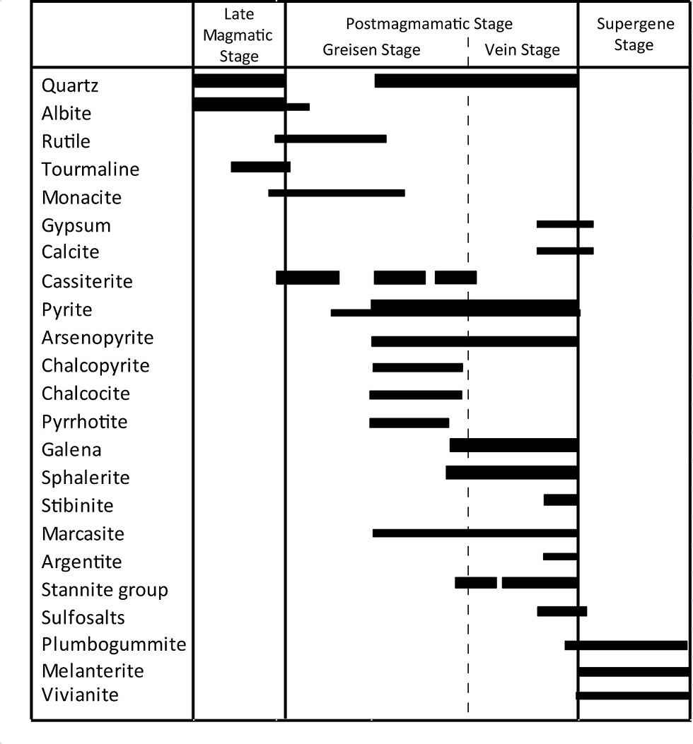 The mineral assemblage of the SFD is consistent with a greisen ore system. In the Santa Fe deposit, three main paragenetic stages can be inferred, from former to latter: (1) Magmatic stage and injection of hydrothermal fluids rich in metals, especially in Sn (resulting in cassiterite precipitation); (2) metasomatism, producing the alteration of metasedimentary sequence as a greisen stage and vein formation with sulfides deposition (In-bearing minerals, mostly stannite); and (3) supergene alteration that formed a replacive paragenesis rich in phosphates.