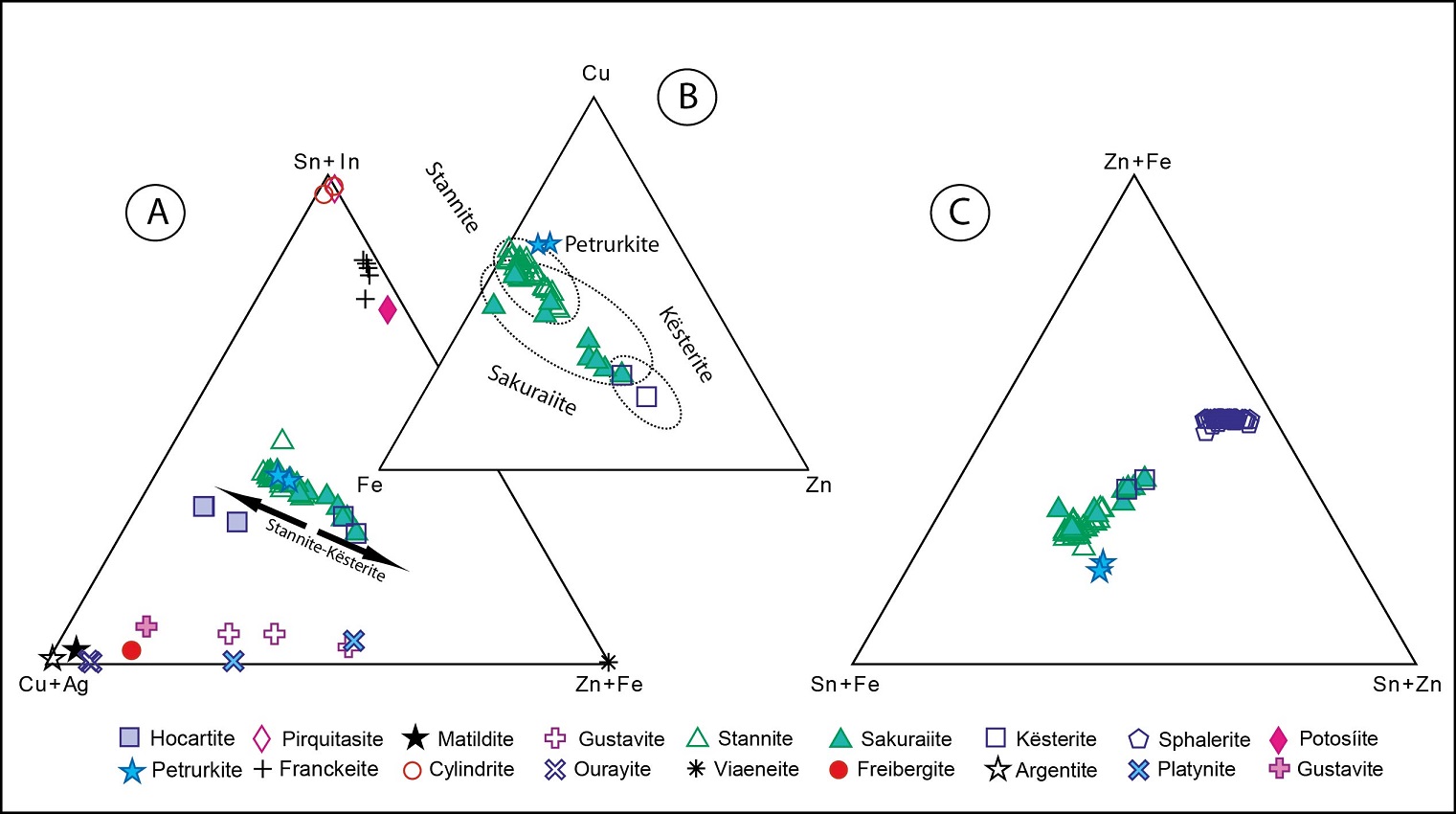 Stannite group has several members; some of them are currently cause of controversy. As mentioned above, stannite is conventionally used for Fe>Zn phases, and kësterite for Zn>Fe, accepting substitutions of [(Zn,Fe)In] for Cu-Sn. However, the most common substitution of Sn for In is seen in sakuraiite (Shimizu et al., 1986). Figure 11A illustrates these compositional variations of stannite group and their relationship with sulfosalts. Sakuraiite analysis can be interpreted as solid solutions along the stannite and kësterite continuous compositional series. The SEM-EDS and microprobe results in this study show that sakuraiite is formed as tetrahedral crystals with a general structural formula as [(Cu,Zn,Fe)3(Sn,In,)S4], which is consistent to Shimizu et al. (1986). Sakuraiite has up to 2.03 wt% of In (Figs. 8F, 11B; Tables 4, 5).
