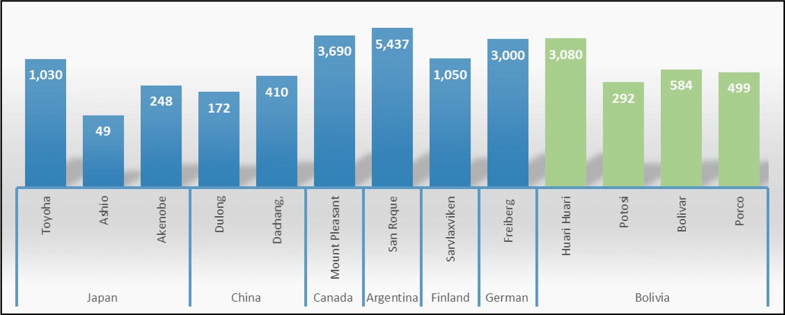 Fig. 12. Indium content of selected In-bearing deposits in ppm. Ore concentrates for Canadian, finnish, german and argentinian deposits, Zn concentrates for japanesse, Chinese and bolivian deposits (Valkama et al., 2016; Murakami and Ishihara, 2013; Dill et al., 2013; Ishihara et al., 2011; Cook et al., 2011b; Sinclair et al., 2006; Murao and Furuno, 1991; Murao et al., 2008, Ohta, 1989; Seifert and Sandmann, 2006).