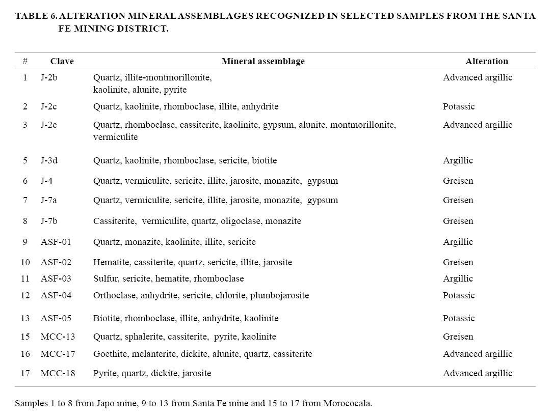 Hydrotermal alteration in the SFD was studied by X-ray diffraction. Several samples, related to the ore deposits, were analyzed in order to recognize cryptocrystalline or clay minerals. The terms used to classify alterations can be expressed as a function of recognized mineral assemblages. In the mineral assemblage presented here, minerals are listed in order of decreasing abundance (Table 6). Advance argillic alteration was recognized in the Japo and Morococala deposits, where kaolinite and dickite±alunite or pyrite was found. Argillic alteration is more evident in the Santa Fe deposit, where kaolinite is associated with sericite, potassic alteration was found in samples from the Japo and Santa Fe deposits, where orthoclase or biotite is present. Finally, an association of sericite, monazite and cassiterite±sphalerite, rutile, hematite and quartz represents greisen alteration.