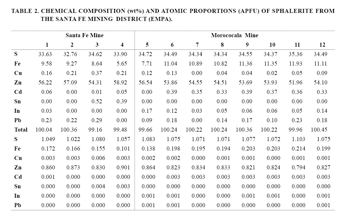 Sphalerite is the second ore mineral in abundance in the SFD, and occurs through all the mineralized zones. It develops anhedral grains, up to few cm across, with curvilinear equilibrium grain boundaries, forming mosaic aggregates and intergrowths with galena, pyrrhotite, pyrite and chalcopyrite (Figs. 5C, 5D). EPMA analyses of sphalerite reveal In contents, up to 0.26 wt% (Table 2), Cd up to 0.39 wt% and Pb up to 0.29 wt%. Sphalerite analyses show a high inverse correlation (r2=0.93) between Fe+Cu+In and Zn (Fig. 7).