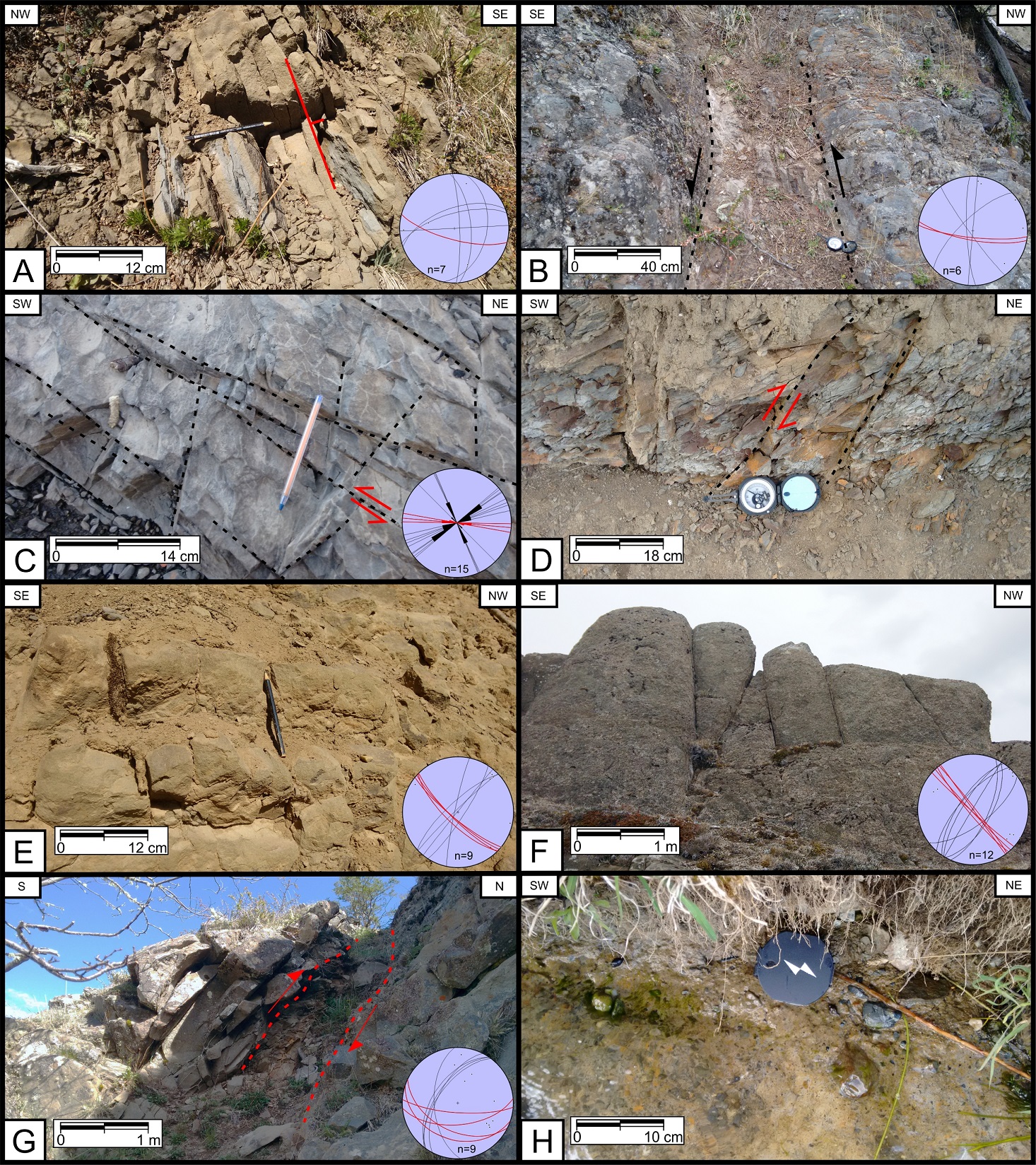 The outcrops at the margins of LY belong to the Late Cretaceous Policarpo Formation, the Paleocene Tres Amigos Formation and to widespread Quaternary sedimentary deposits (Fig. 4H). The Mesozoic unit corresponds to grey mudstones (Fig. 4A, C, D) and sandstones (Fig. 4B); the former often show compressive deformation (Fig. 4B, D) when involved in thrusts. Tres Amigos Formation outcrops are mostly sandstones (Fig. 4E, G) and coquinae (Fig. 4F) of fairly constant WNW-ESE strike sometimes displaced by thrusts (Fig. 4G).