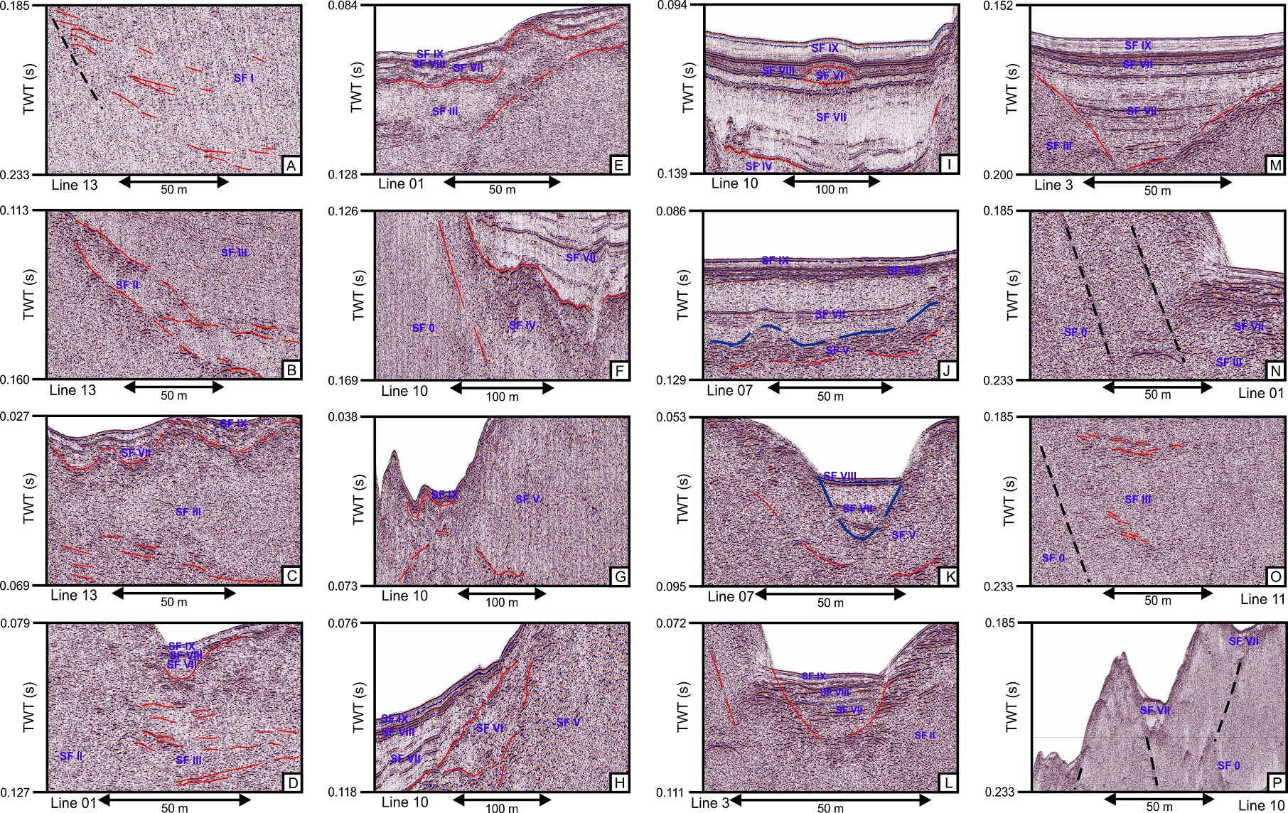 SF VIII.A thin unit (~0.002 TWT s, 3 m) that overlies SF VII in both sub-basins (Figs. 6, 7), bounded by strong and continuous reflectors (Fig. 9K). Within SFVIII twelve strong, continuous and parallel reflectors are recognized; locally a small package of a few chaotic and transparent reflectors is enclosed within SF VIII (Fig. 9I).