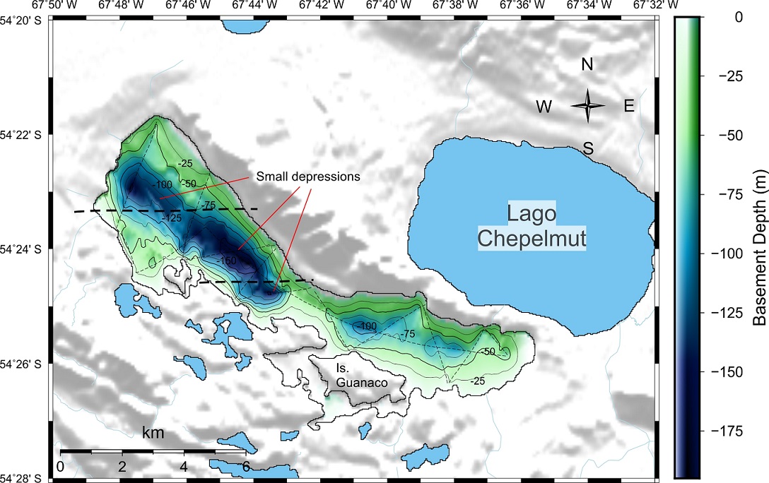Lago Yehuin, a WNW-ESE elongated basin located in the outer fold-and-thrust belt of the Fuegian Andes, occupies a compartmented structural depression originated along a segment of the left-lateral Lago Deseado fault system. This paper describes the first geophysical survey performed within the lake. New acquired high-resolution single-channel seismic data, integrated with geological information in the surroundings of the Lago Yehuin, allowed to: (i) produce a complete bathymetric map of the lake, (ii) reconstruct the basement surface of the lake, and (iii) analyze the geometry, distribution, and thickness of the sedimentary infill. Two sub-basins were recognized within Lago Yehuin: A western sub-basin, 7.5 km long, with a maximum depth of 118 m; an eastern sub-basin, 7.2 km long with a maximum depth of 80 m. Both sub-basins are limited by a set of normal faults which overprint NE-verging thrusts. Three seismo-stratigraphic units have been identified in the seismic records: (1) a lower unit with wedged geometry interpreted as a mass flow deposits; (2) a thick (up to 120 m) intermediate unit of glacio-lacustrine nature and irregularly distributed in the Yehuin basin; (3) a thin (generally <10 m) upper lacustrine unit which drapes the entire basin. Lago Yehuin is considered a Neogene basin generated by strike-slip tectonics that was later affected by glacial and glacio-lacustrine deposition. Interpreted submerged ridge moraines within Lago Yehuin are correlated with onland moraine arcs built by the complete recessional paths of Fuego and Ewan ice lobes. A significant structural control is proposed not only for the formation of Lago Yehuin, but also for the general paths of the northern arms of the Fagnano palaeo-glacier.