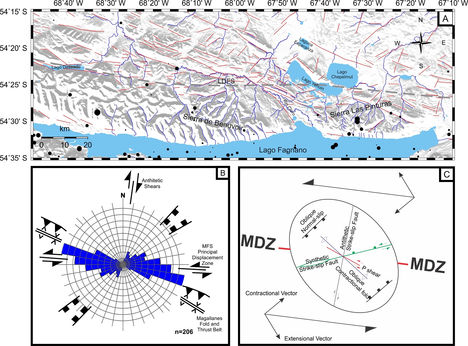 Fig. 11. A. Main structural lineaments from ASTER and SRTM images, in the area north of lago Fagnano, central Tierra del Fuego; black circles represent the hypocenter of shallow seismic events (between 0-30 km depth); the blue lines are the hydrography of the area; grey dashed line mark the position of the inferred Lago Deseado Fault System; the red lines are the identified lineaments; B. Rose diagram summarizing the azimuth and length distribution of the identified lineaments. Also, four lineament trends are shown around the rose displaying the interpreted tectonic significance from Lodolo et al. (2003); C. Riedel shear model for the area; MDZ: Main deformation zone.
