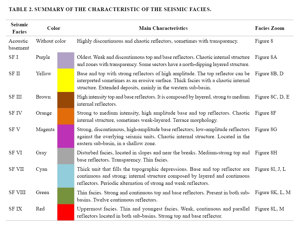 SF III. Facies SF III (Fig. 9C) comprises a thick package of 0.06 TWT s. It displays a layered structure with parallel, strong to medium reflectors. Its upper reflector shows some diffractions mainly in the Western sub-basin (Fig. 6). Some irregular discontinuities are observed within this facies; against these unconformities. The irregular top surface defines small depocenters. This can be interpreted as a depositional landform or, in some sectors, as an erosive unconformity.