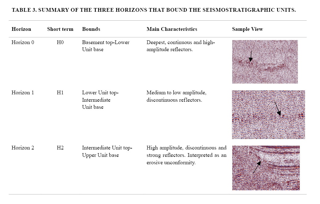 All the seismic units rest on a recognizable acoustic basement whose top is generally defined by a continuous and high-amplitude reflector, H0 (Table 3). Deepest depressions defined by the stepped geometry of H0, host the Lower Unit which top corresponds to a medium to low-amplitude and discontinuous reflector, H1, interpreted as an angular to erosive unconformity. Resting either above H0 or H1, the Intermediate Unit is capped by a high amplitude, sometimes discontinuous and strong reflector, H2, displaying small depressions. Given the irregularity of H2 and the contact with the overlying reflectors, this surface is interpreted as an erosive unconformity. The acoustic basement (SF0) is characterized by highly discontinuous, chaotic reflectors with some transparent intervals. Based on the geology of the area and the outcrops observed in the lake shoreline (Figs. 2, 4) the basement likely corresponds to Upper Cretaceous-Paleocene rocks pertaining to the Policarpo and Tres Amigos formations.