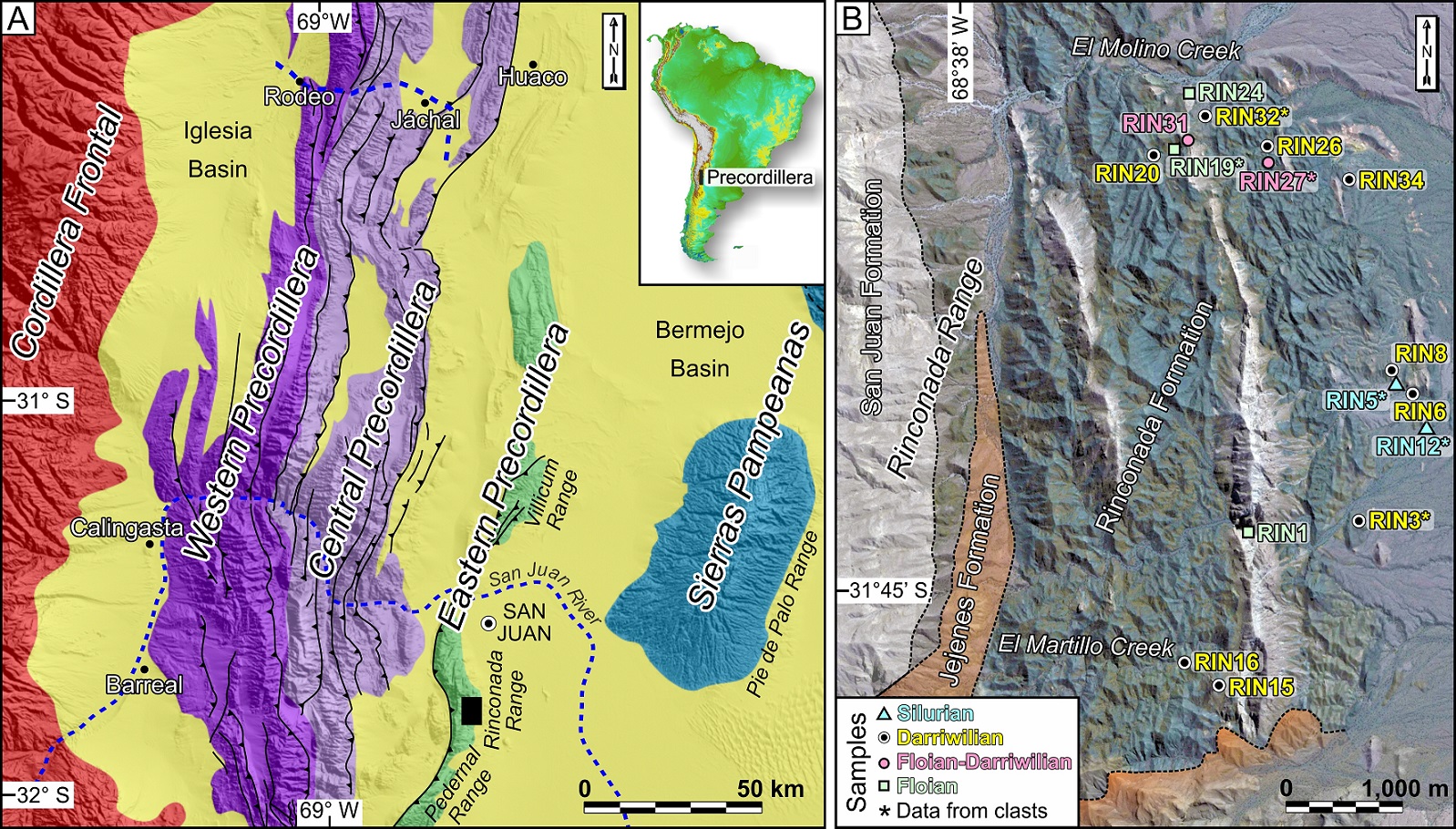 In a more plausible explanation, we envisage that the large carbonate blocks along with their sedimentary cover slid from an eastern orogenic front into the basin floor (Fig. 5). Accordingly, the middle Darriwilian quartz-arenite blocks of the Rinconada mélange would represent part of the synorogenic clastic wedge that was generated during the accretion of the Precordillera to Gondwana (Astini et al., 1995; Thomas et al., 2015). In addition, the Holmograptus spinosus Zone (sample RIN16) has been recorded in calcareous nodules from the top of the Gualcamayo Formation in the Villicum Range (Kaufmann and Ortega, 2016), but is absent in the Central Precordillera due to a hiatus (Ortega et al., 2007). Instead, the synorogenic sedimentation is partially represented in the Villicum Range by the La Cantera Formation (late Darriwilian), which includes at its base clasts with fragments of Sacabambaspis janvieri. This early agnathan fish inhabited the shallow water continental margins of Gondwana, thus strengthening the palaeobiogeographic connection of the Precordillera with Gondwana by the late Darriwilian times (Albanesi et al., 1995).