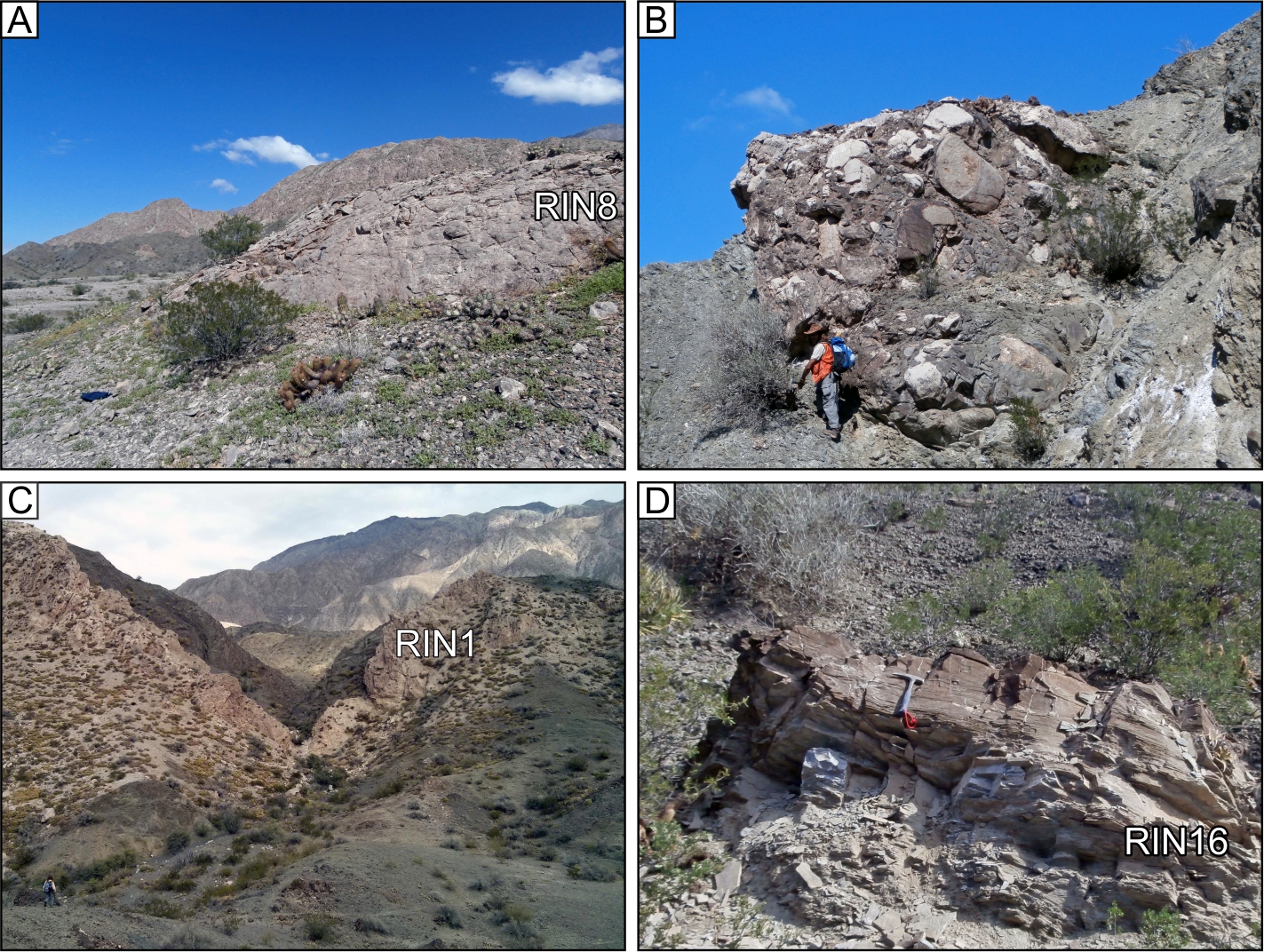 The age of the Rinconada Formation is difficult to establish due to the inherent reworked nature of the mélange and the scarcity of its fossil content. Regionally, it overlies through an erosional hiatus the passive-margin limestones of the San Juan Formation (Lower to Middle Ordovician). The lacuna is narrower in the Villicum and Pedernal sections where the mélange rests over late Middle-Late Ordovician siliciclastic foreland deposits (Gualcamayo, La Pola and La Cantera formations), or the glacial-related Hirnantian-Llandovery Don Braulio Formation (Peralta, 1993; Astini, 2001; Mestre and Heredia, 2014). Considering that the base of the formation is synchronous, a maximum age is given by the latter stratigraphic unit, which contains Rhuddanian fossils (Volkheimer et al., 1980; Peralta, 1986).