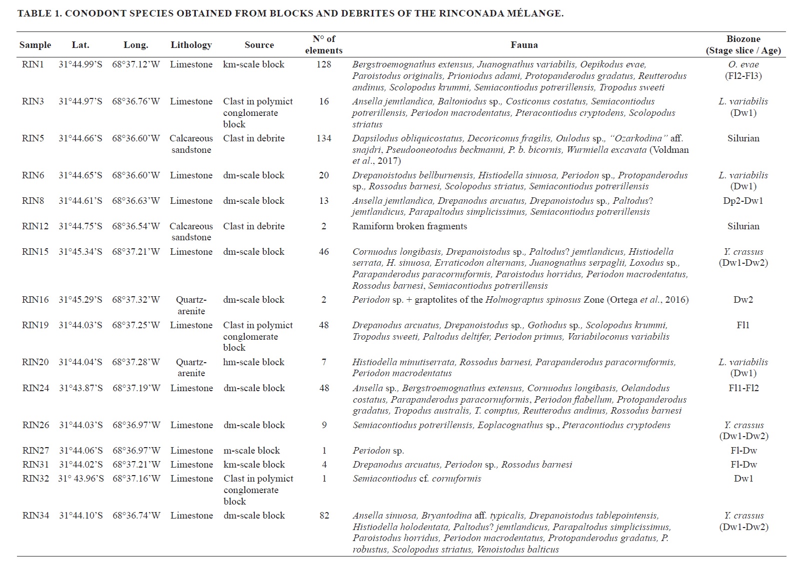 The Rinconada Formation is a mélange that crops out in the eastern margin of the Argentine Precordillera, an exotic terrane accreted to Gondwana in Ordovician times. Its gravity-driven deposits have been studied by means of conodont and graptolite biostratigraphy, and complemented with stratigraphic analyses. 46 rock samples (85 kg total weight) were obtained from blocks of limestones and of carbonate-cemented quartz-arenites, and from limestone clasts included in conglomerate blocks and debrites. 16 of these samples were productive after standard laboratory acid procedures, yielding 561 conodont elements. The specimens occur in variable number per sample and are frequently fragmented, but they reveal the occurrence of phantom stratigraphic units in the Darriwilian of the Precordillera. Lithological and fossil evidence from the Rinconada Formation provide new constraints on the biostratigraphy, palaebiogeography and tectonostratigraphic history of the southwestern margin of Gondwana during the Ordovician to Lower Devonian times.