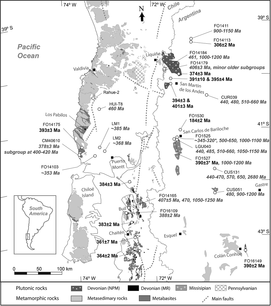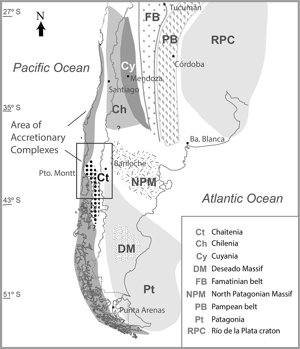 In the present-day North Patagonian Andes, recent SHRIMP U-Pb dating of the crystallization age of zircon from intrusive igneous bodies, together with their O and Lu-Hf isotopic characteristics (Hervé et al., 2016), suggested that Devonian igneous rocks constituted two magmatic belts: an eastern one emplaced in the continental crust of Patagonia and the other developed in an oceanic island arc to the west that was later accreted to Gondwana. The oceanic island arc terrane has been referred to as Chaitenia (Hervé et al., 2016) and is thought to have extended southwards from the Huincul lineament, the southern limit of Chilenia (Ramos et al., 1984). Chernicoff et al. (2013) have proposed that a Devonian magmatic arc was developed over the western edge of a “Southern Patagonia terrane”, during east-directed subduction previous to collision with Patagonia, but they considered that the arc was built over an old continental fragment.