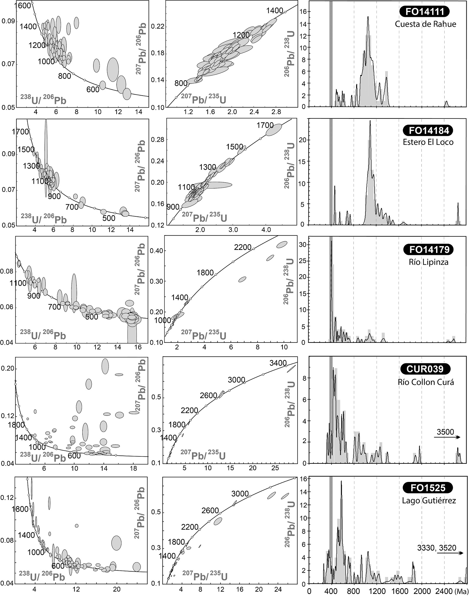 FO1525 is a mica schist from the southeastern end of lago Gutiérrez. The U-Pb zircon age distribution (Fig. 3) shows prominent but dispersed clusters between 500 and 650 Ma, rather minor “Grenville-age” peaks (1050 Ma) and ca. 1850 Ma, as well as some Archaean ages back to ca. 3500 Ma. At the younger end of the spectrum scattered Late Paleozoic ages include four clear metamorphic rims with Permo-Carboniferous ages of 260-330 Ma. This sample shows little evidence of either Ordovician or Devonian provenance, nor of Early Devonian metamorphism. This and the two following samples form part of the Colohuincul Complex (Cruz Martínez et al., 2012).