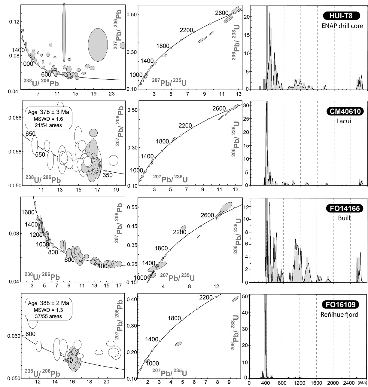 On the other hand, U-Pb SHRIMP dating of zircon from other igneous intrusive rocks in the coastal metamorphic complex slightly east of Buill (Hervé et al., 2016) suggest continuation of magmatism and sedimentation in Chaitenia into Late Devonian times (Pichicolo 384±3 Ma, Chaitén 383±2 Ma, Centro del Mundo quarry 361±7 Ma).
