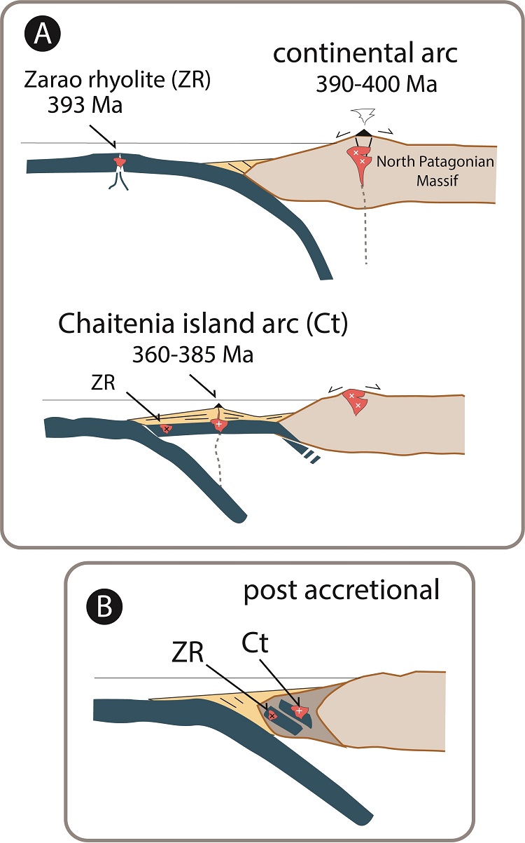 Scattered outcrops of metamorphic rocks in the Andean region and in the western part of the North Patagonian Massif have detrital zircon grains indicating that they were deposited during (or perhaps in some cases slightly before) Devonian times. Some samples show the effects of a Devonian metamorphic event, which has been previously assigned to the collision of Chilenia with Patagonia. Here we prefer to consider a collision of a separate oceanic island arc suspect terrane, Chaitenia, as suggested in Hervé et al. (2016) extending south of the Huincul lineament which is considered the southern limit of the Chilenia terrane by Ramos et al. (1986). Chaitenia plutonic rocks differ from the ones of the Devonian magmatic arc in the Patagonian Massif in the isotope geochemistry of zircon, and have different lithologies in their country rocks. However, a metasedimentary rock of Chaitenia, which is interbedded with pillow metabasalts (Fig. 7) shows no major provenance differences from those of the continental foreland, suggesting that the island arc formed in a proximal position to the Gondwana margin while magmatism was active (Fig. 8). These rocks constituted a backstop to the late Carboniferous -Triassic accretionary prism which extends further west.