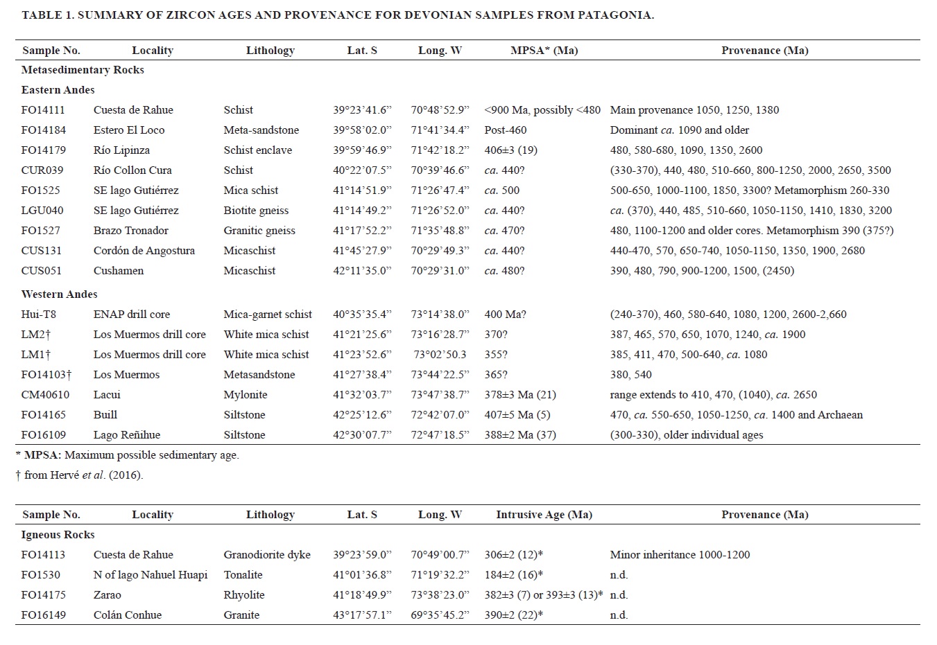 Hervé, F.; Calderón, M.; Fanning, C.M.; Pankhurst, R.J.; Fuentes, F.; Rapela, C.W.; Correa, J.; Quezada, P.; Marambio, C. 2016. Devonian magmatism in the accretionary complex of southern Chile. Journal of the Geological Society 173: 587-602. doi:10.1144/jgs2015-163. London.