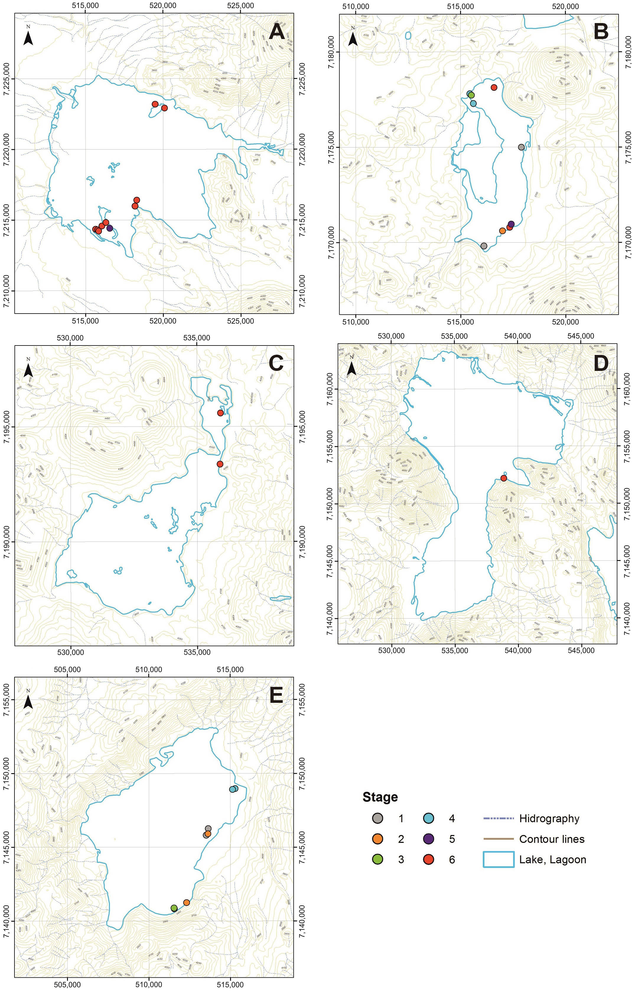 This stage has been observed in Agua Amarga Salar (Fig. 2B) and Aguilar Salar (Fig. 2E), through the domes still submerged in the lagoons, and in Agua Amarga Salar (Fig. 2B) and Pajonales Salar, by the structures emerged on the surface and surrounded by the saline crust.
