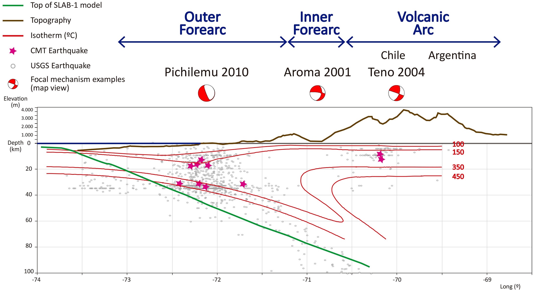 Seismic data is an essential tool with which to constrain and characterize plate tectonics. Major seismic catalogues, such as those maintained by the International Seismological Centre (ISC), National Earthquake Information Centre (NEIC), the ANSS Comprehensive Earthquake Catalog from USGS (2018a), Integrated Plate Boundary Observatory Chie (IPOC) and CMT-Harvard, include data from crustal earthquakes all over the Chilean Andes. Nevertheless, in several cases the hypocentral locations of these events are not sufficiently well constrained to distinguish shallow intra-crustal earthquakes from subduction earthquakes. This is particularly important for events recorded in the forearc, where seismicity in the overriding plate detected from teleseismic observations is often masked by the stronger interplate seismicity. However, catalogue data show a clear concentration of seismicity in the Chilean fore-arc region, in contrast with scarce intraplate crustal seismicity in the Main Cordillera of the Andes (e.g., Pardo et al., 2002; Asch et al., 2006). Along the length of the Central and Southern Andes, intraplate seismicity tends to be localized within the weak lithosphere, where the brittle-ductile transition is located at less than 15 km depth (Tassara et al., 2007).