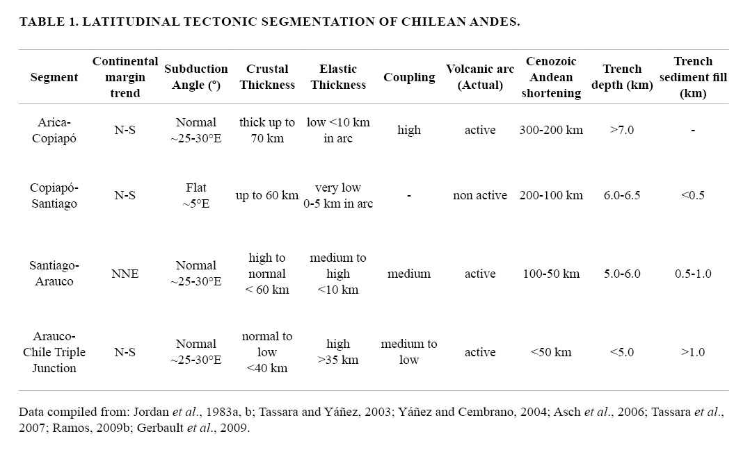 A latitudinal segmentation (across-strike relative to the continental margin/Chilean trench) of the Chilean continental lithosphere into at least five different tectonic domains has been recognized by various authors: Arica-Copiapó, Copiapó-Santiago, Santiago-Arauco, Arauco-Chile Triple Junction, and South of Chile Triple Junction (e.g., Jordan et al., 1983a, b; Tassara and Yáñez, 2003; Yáñez and Cembrano, 2004; Ramos, 2009b; Gerbault et al., 2009). The main tectonic characteristics of these domains are shown in table 1 and figure 1.
