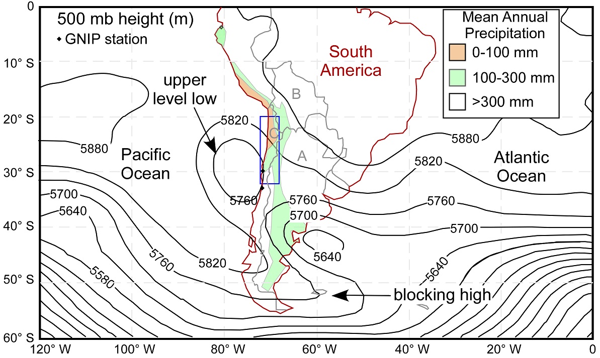 The key atmospheric circulation feature at 0000 UTC 25 March 2015 (local time 21:00 h, 24 March) is the “cutoff low” at middle to upper levels of the troposphere near 75° W, 30° S (Fig. 1). To the south is a persistent anticyclonically breaking wave in the height field near 45° S that caused atmospheric blocking (Barrett et al., 2016). A high content of precipitable water in the atmosphere over the eastern equatorial Pacific was a second key attribute in setting up the extreme precipitation event (Barrett et al., 2016). As a consequence of both features, upper level winds were from the northwest over the north Chilean Pacific coast and transported anomalously moist air into the region.