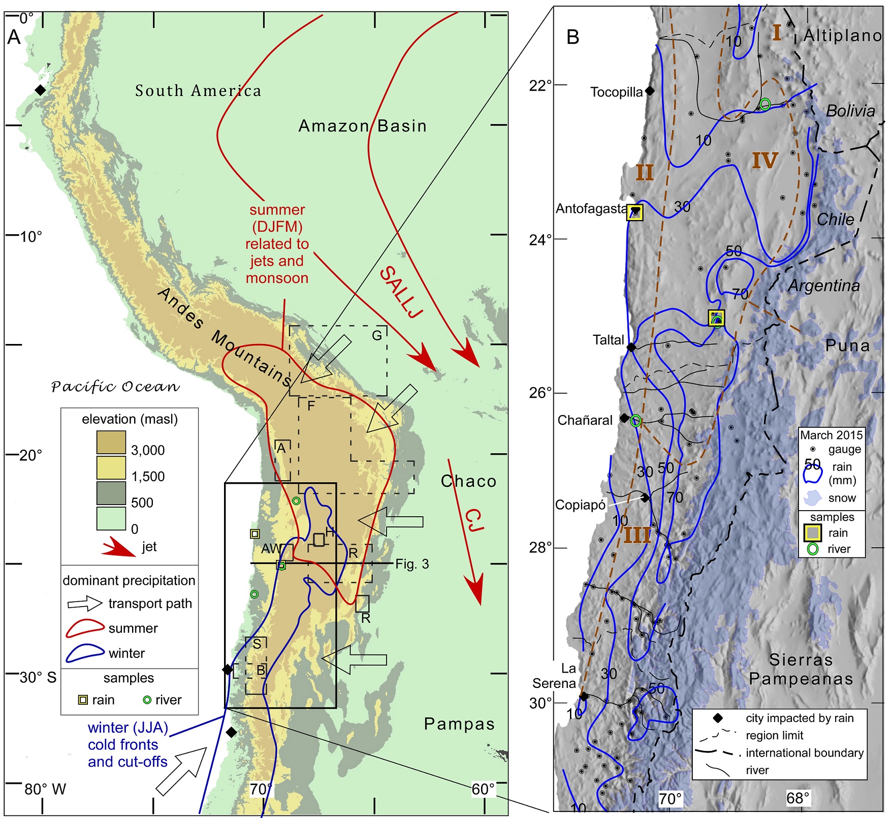 Fig. 2. Regional precipitation climate system of western South America, the precipitation distribution for the March 2015 event, and water sample locations. A. Topography of west central South America (colors) is dominated by the Andes Mountains which are a barrier to air masses. Regions in the Andes Mountains that are outlined in blue receives winter precipitation from the south and southwest. The Andean region outlined in red receives most precipitation during summer months, derived from Atlantic Ocean sources via the Amazon Basin. Low level atmospheric jets (red streamlines and arrows) are a principal control on water vapor pathways: the summer season South American Low-Level Jet (SALLJ) and Chaco Jet (CJ). Gray-outline arrows schematically show water vapor delivery paths. Gray dashed-line boxes show regions with published water isotope data from samples of precipitation and/or surface streams in regions whose precipitation climatology is linked to that of northern Chile (Fig. 4). A: studies of Fritz et al. (1981); Aravena et al. (1999), and Uribe et al. (2015); S: studies of Strauch et al. (2009); B: work by Burgener et al. (2016); AW: studies by Alpers and Whittemore (1990); H: studies by Herrera et al. (2016); R: studies by Rohrmann et al. (2014); G: studies by Gonfiantini et al. (2001); F: studies by Fiorella et al. (2015). B. Rainfall for 23-27 March 2015 (contours in millimeters based on the station data given in Appendix Table A1) and snowfall distribution for March 2015 event (from satellite data). Dashed brown lines and Roman numerals demarcate major hydroclimate zones: IV is the hyperarid core of the Atacama Desert.