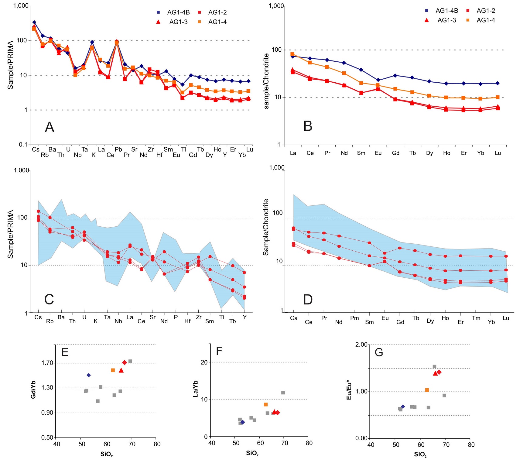 Primordial mantle-normalized trace-element trends exhibit a clear enrichment in LILE over HFSE (Fig. 5A) with similar patterns as the obtained for the Ovejas Batholith. This can be compared in figure 5C and by the [La/Yb]N ratio values in figure 5F. Nb, Ta and Ti negative anomalies, and Zr, Hf positive anomalies are identifiable (Fig. 5A). Chondrite-normalized REE patterns show enrichment in LREE versus HREE with similar patterns as those obtained for the Ovejas Batholith. Nevertheless, Antioquia batholith has less steep MREE-HREE patterns, indicated by the Gd/Yb ratio.